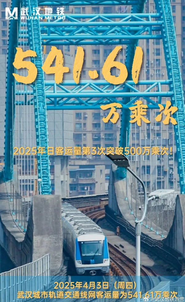 据武汉地铁运营微博数据显示,4月3日,武汉地铁线网客运量541.61万乘次,位列线网历史第三高,也是继今年3月21、22日之后第三次进入“500万+”。