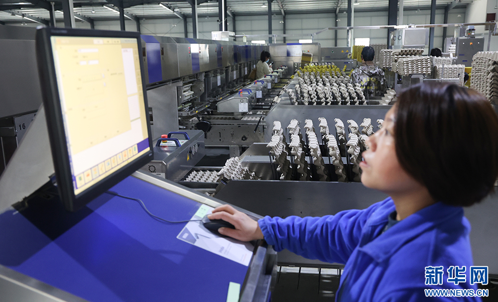 宏农公司10余名工人操控全智能设备每小时处理12万枚鸡蛋。新华网连迅摄
