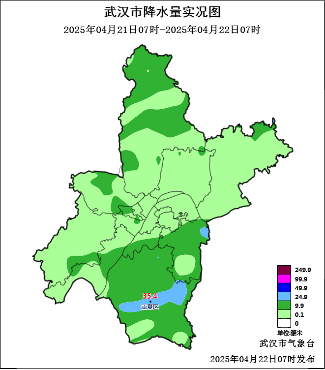 昨天全市小到中雨,江夏中南部大雨;过去24小时最大累计雨量为江夏乌龙泉五星站35.4毫米,最大小时雨强为江夏梁子湖南咀站22.8毫米(21日08~09时)。夜间受冷空气南下影响,全市出现3到4级偏北风,大部阵风5到7级,最大阵风为黄陂矿山站25.7m/s(10级,21日23时40分)。昨天最低气温21~23℃,最高气温26~28℃。今天早晨武汉阴天到多云,最低气温19~21℃。