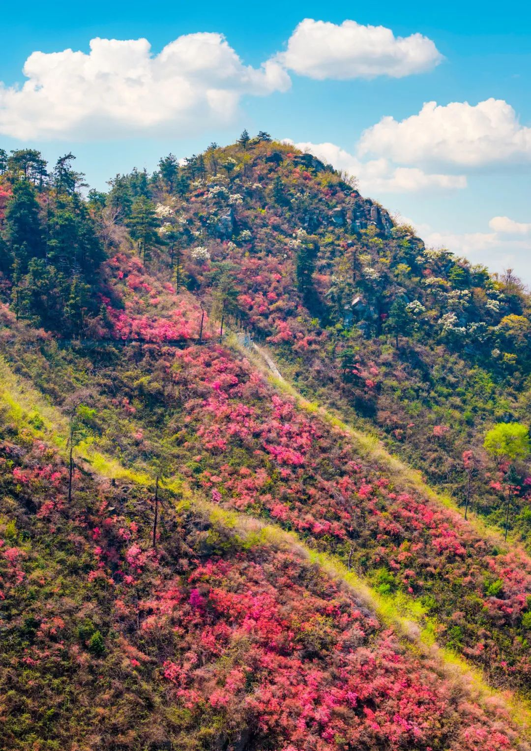 蔚蓝的天空下,杜鹃花朵朵怒放,就像是大地为世界带来的锦绣色彩,在粉红到殷红间过渡,渲染山景的壮美。