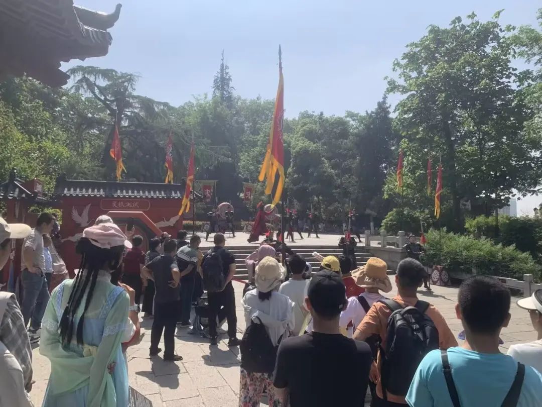 5月1日9时许,已有大批外地游客赶到黄鹤楼,把这里作为武汉游的首站打卡地。黄鹤楼岳飞广场的演出《精忠报国》,引得观众纷纷叫好。