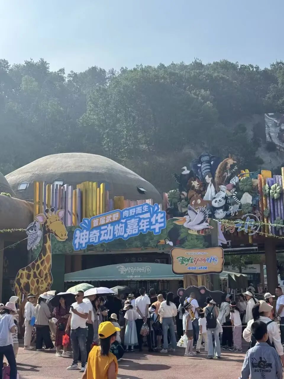 10时许,武汉野生动物王国景区人潮涌动,游客有序排队入园,不少家长带着孩子亲近大自然。