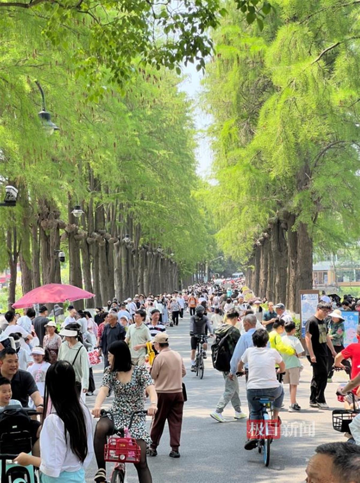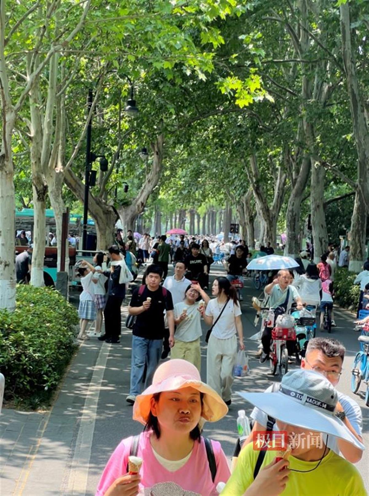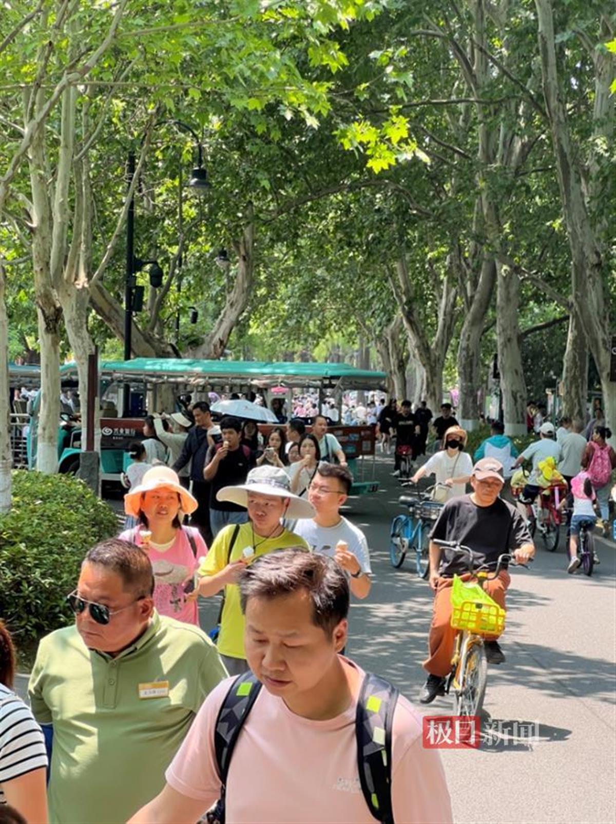 5月1日是五一假期第一天,游客从四面八方来到武汉。中午时分,尽管天气炎热,但依然抵挡不住游客到东湖绿道游玩的热情。