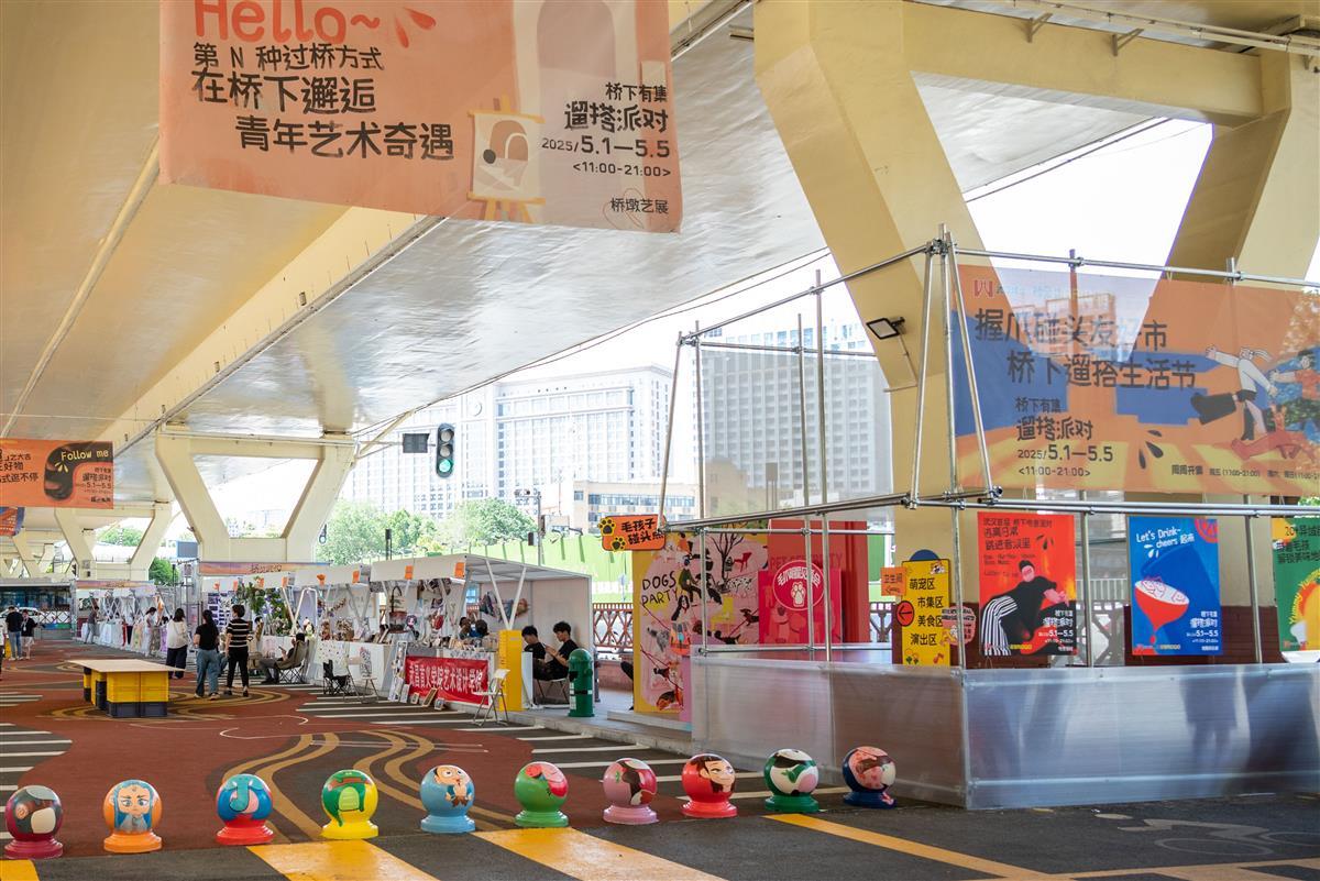 傍晚六时,整片桥下空间骤然换上夜行衣。霓虹灯牌次第亮起,生活灵感市集的80个宝藏摊位变身发光岛屿,手作银饰的敲击声、铁板鱿鱼的滋滋声、精酿啤酒的碰杯声交织成烟火交响曲。