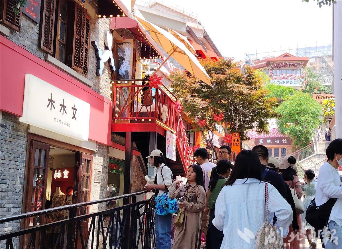 5月1日中午,湖北日报全媒记者来到昙华林,只见游客熙攘,川流不息。主街两侧的“甜宠市集”以宋朝十二时辰为场景,甜点手作与非遗技艺吸引游客驻足,糖画、漆扇绘制等体验摊位前排起长龙。“楚辞里的烟火人间”古风市集,则用荆楚风味小吃、绒花缠花等非遗手工艺品,再现古代楚人的烟火日常。二次元爱好者则涌入“次元奇遇艺术市集”,动漫周边、国潮手作等活动让年轻游客直呼过瘾。