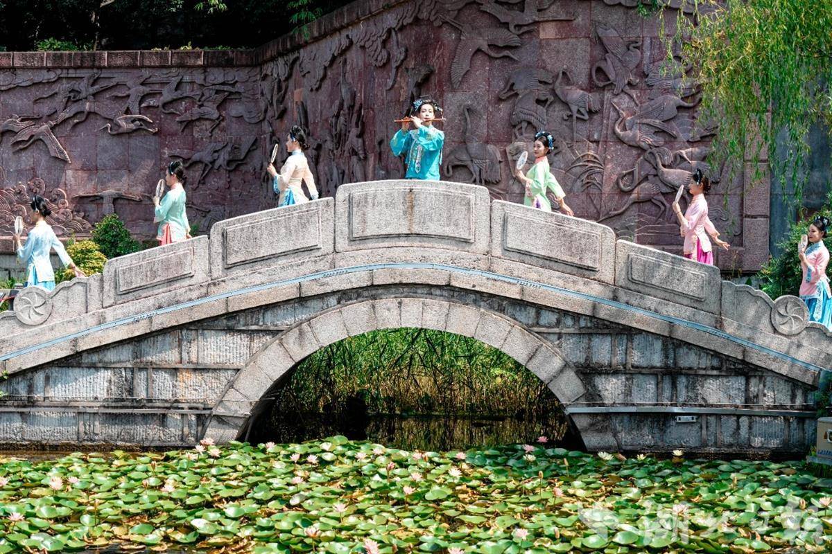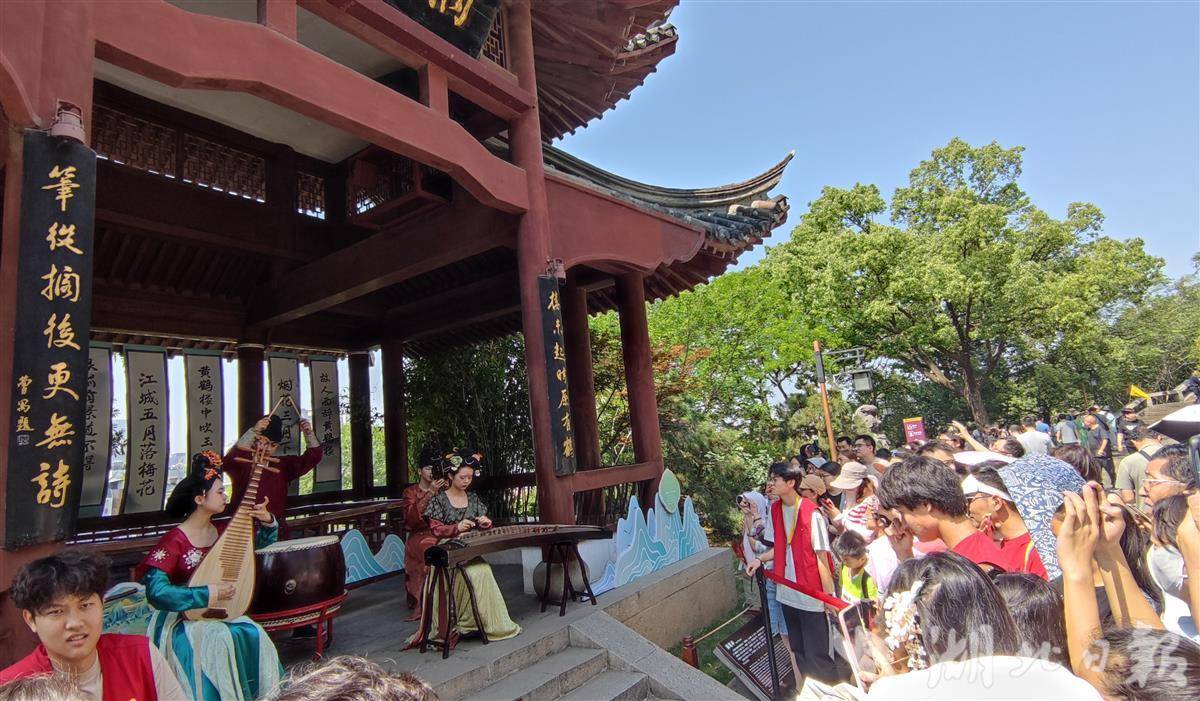 当天,从东门至主楼,黄鹤楼公园俨然化身国风演艺场、文化博物馆。东门广场汉剧悠扬,《贵妃醉酒》的水袖轻抛唤醒楚腔汉调;岳飞广场鼓点铿锵,《精忠报国》乐舞以剑影寒光诠释家国情怀。落梅轩内,编钟叮当悠扬,《鹤舞楚天》用曾侯乙编钟复刻件奏响《楚商》古调,不少观众纷纷举起手机,记录这“穿越千年古音回响”。