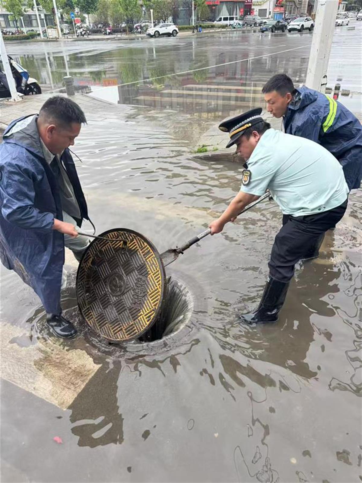 黄陂城管综合执法大队直属二中队重点对校园周边积水、井盖破损等情况进行巡查,并组织人员进行“护学”,引导家长安全接送。盘龙中队联合专业市政人员,对沿路积水点位进行杂物清理、打开井盖排水,对严重积水点位进行抽排。