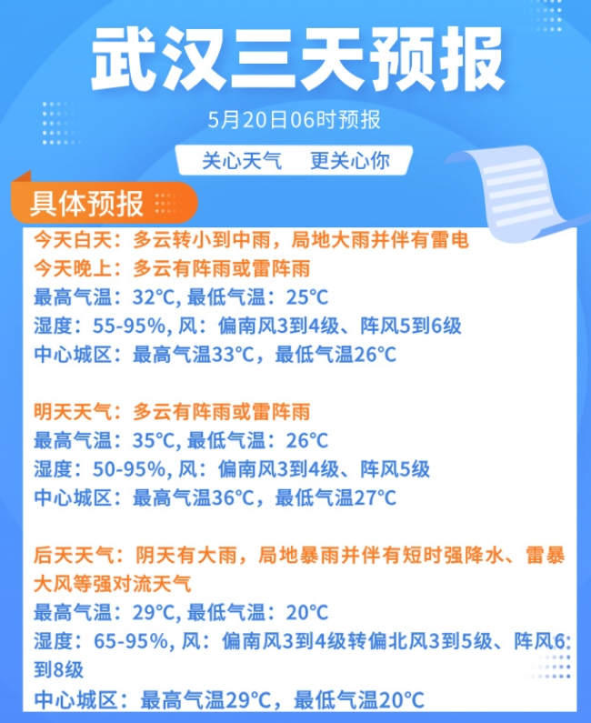 5月20日08时-21日08时,江汉平原东部、鄂东南、鄂东北多云转小到中雨、局地大雨并伴有短时强降水和雷暴大风等强对流天气;其他地区多云,局地有阵雨或雷阵雨。最高气温西部34~38℃、东部29~33℃,最低气温西部19~23℃、东部23~26℃,偏南风3到4级、阵风5到7级。