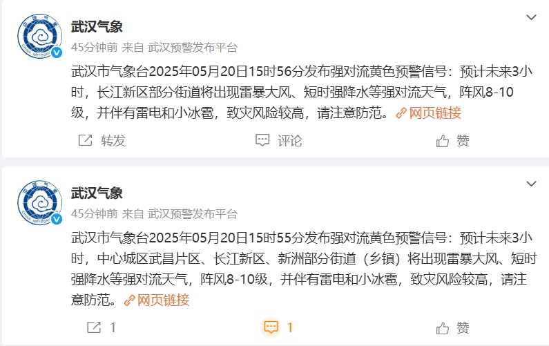 预计未来3小时,长江新区部分街道将出现雷暴大风、短时强降水等强对流天气,阵风8-10级,并伴有雷电和小冰雹,致灾风险较高,请注意防范。预计未来3小时,中心城区武昌片区、长江新区、新洲部分街道(乡镇)将出现雷暴大风、短时强降水等强对流天气,阵风8-10级,并伴有雷电和小冰雹,致灾风险较高,请注意防范。