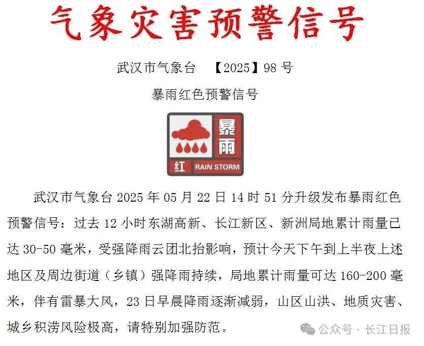 2025年05月22日08时—2025年05月23日08时,预计神农架林区中北部、十堰(郧西县中北部、丹江口市东部)、襄阳(襄城区、老河口市西部、谷城县东部、宜城市西部、南漳县)、宜昌市(点军区、猇亭区、伍家岗区、夷陵区东部、长阳土家族自治县东部、远安县东部、宜都市、当阳市、五峰土家族自治县)、恩施(恩施市西南部、利川市西北部、咸丰县北部、鹤峰县西部和东部、来凤县)、荆门(直属分局、东宝区、漳河新区、钟祥市西部、京山市北部)、荆州(松滋市西部)、随州(曾都区南部、随县南部、大洪山风景名胜区)、孝感(孝昌县东部、大悟县中部和南部、安陆市西北部)、武汉(汉阳区局部、黄陂区北部、武昌区局部、江夏区中部)、鄂州(鄂城区、梁子湖区、华容区局部、葛店开发区局部)、咸宁(咸安区、通山县、赤壁市、嘉鱼县、通城县、崇阳县)、黄石(西塞山区、铁山区、下陆区、开发区、大冶市、阳新县)、黄冈(黄州区、红安县、麻城市、罗田县东部、英山县、蕲春县西南部、武穴市、黄梅县北部)以及其他强降水区域发生崩塌、滑坡、泥石流的风险较高,请注意防范!