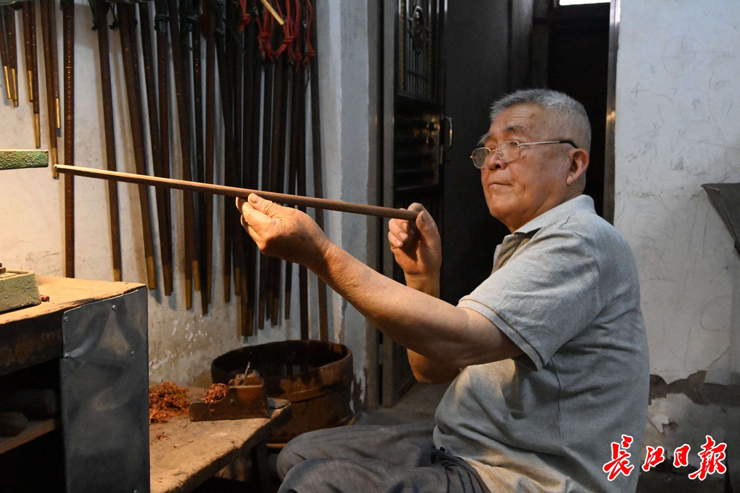 在新洲区老街路,两侧多是卖鱼卖肉的小商贩,在吆喝声中,头发花白、戴着金丝眼镜的老人江远斌带着记者,拐进一条窄窄的小巷子,再往里走,推开江家秤铺的门。