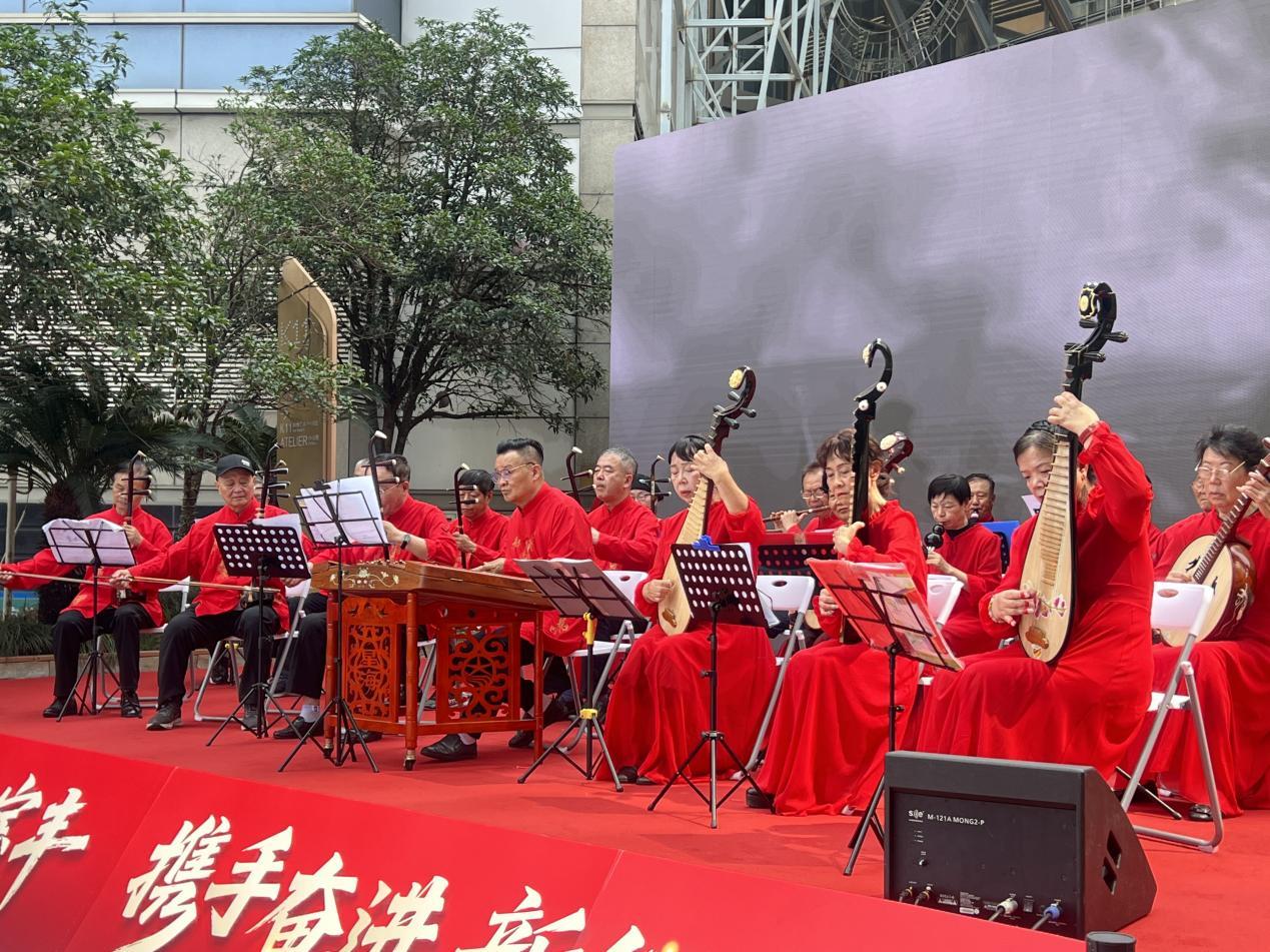 来自宝地社区的民乐合奏《南湖航船》,以中国共产党成立为背景,作为本次活动开场序章。由辖区共建单位湖北省烟草公司金叶艺术团民乐团以8种民乐合奏出的激昂旋律,演绎了中国共产党一百多年的岁月征程。一艘从南湖驶来的红船,开启了引领中华民族伟大复兴的浩荡航程;一段映照“红船精神”的初心旋律,从演奏者的指尖流淌到观众心间。
