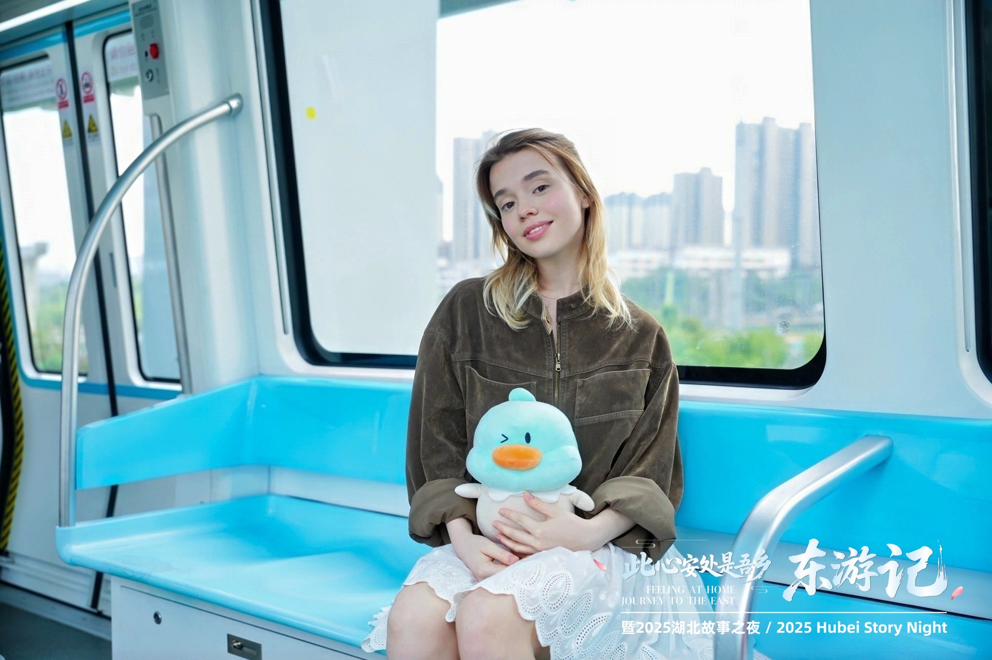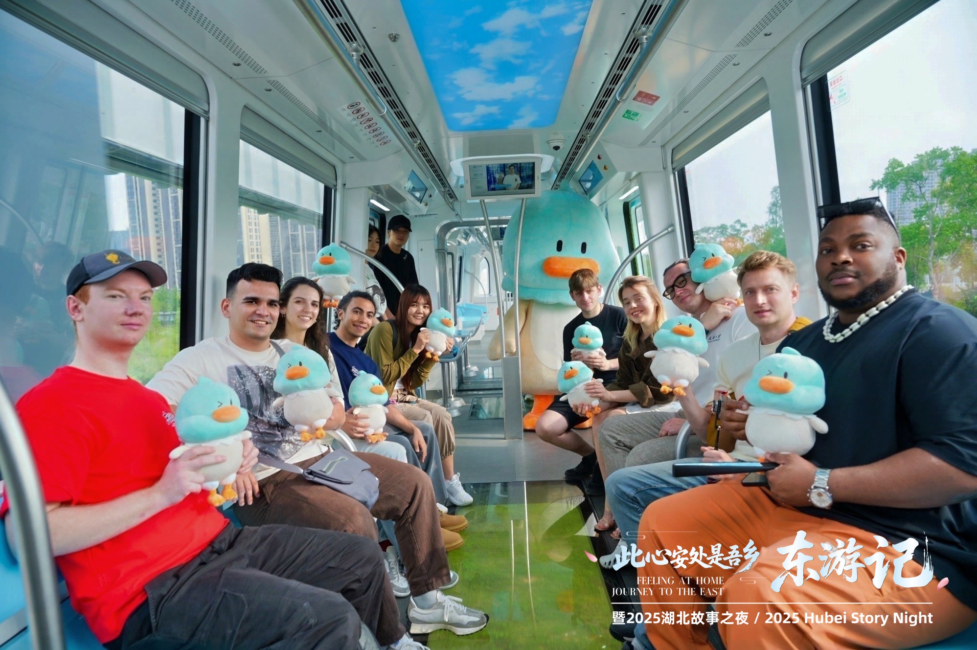 武汉新晋网红打卡地怎么少得了光谷空轨,在吉祥物青青鸭的带领下,体验官们踏上了空中交通之旅。270°全景视窗将城市天际线变成流动画卷,无人驾驶系统在空中穿行如科幻大片。这种新奇的乘车体验引得大家连连赞叹,俄罗斯留学生可欣兴奋的说,“我感觉自己飞起来了,像鸟一样飘在空中。”