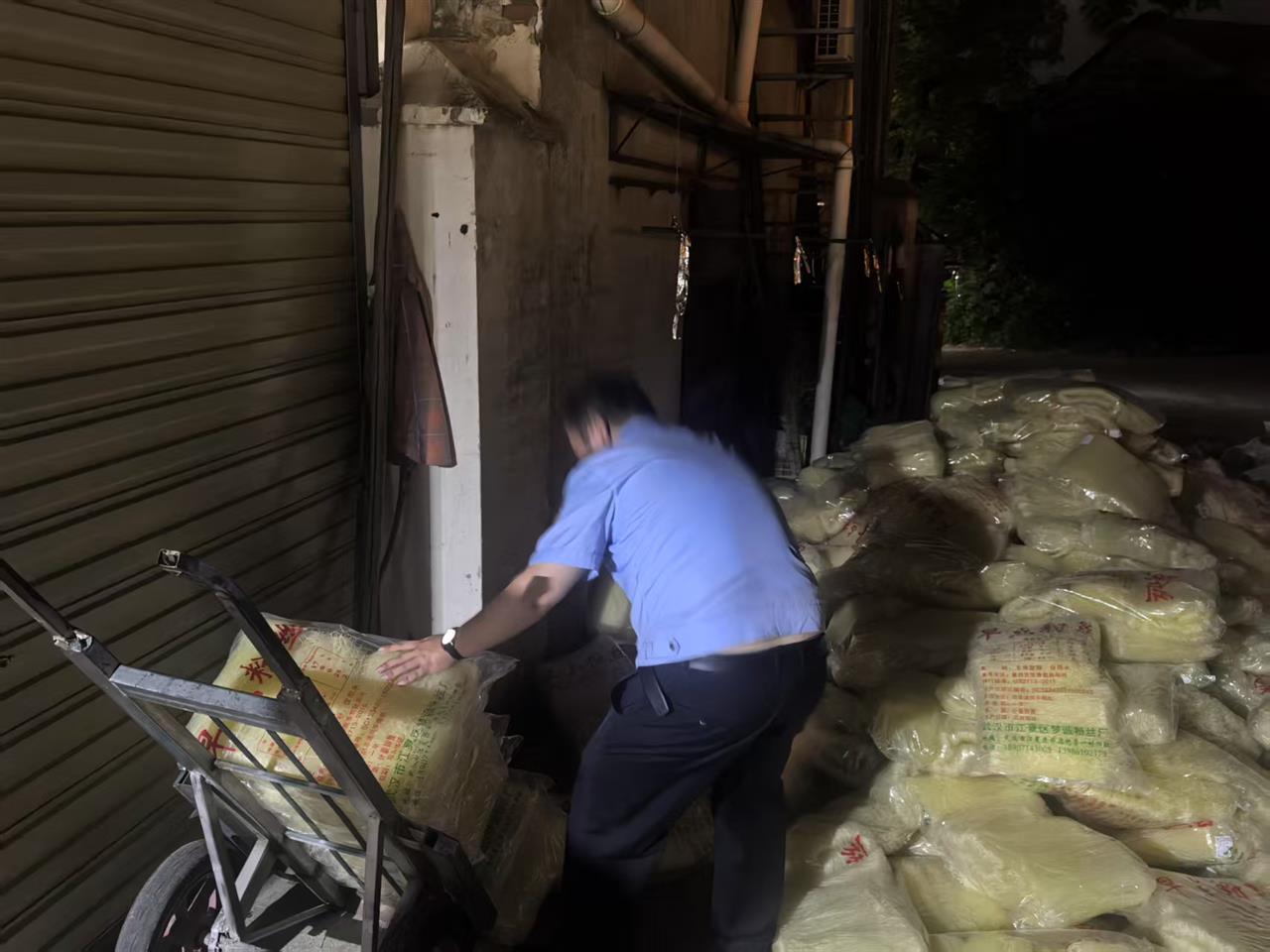 在昏暗的灯光下,张逸峰和辅警顾不上擦拭额头上不断滚落的汗珠,一趟又一趟地将干米粉一包包搬上手推车,再推进仓库。尽管衣服早已被汗水浸透并紧贴在身上,他们却没有丝毫停歇。终于赶在暴雨来临前,将4.2吨干米粉全部转移至仓库内。