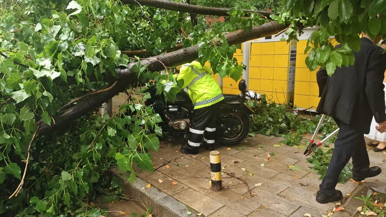 假期第二天,武汉持续降雨,藏龙岛中队民辅警在栗庙南路巡逻时,发现一棵大树被风雨刮倒,不仅占据了一半路面,更压住了路边停放的车辆,严重阻碍通行。情况紧急,藏龙岛中队警力迅速集结,紧急联系车主转移车辆、合力清障,以最快速度打通受阻道路,守护了风雨中的车轮滚滚。