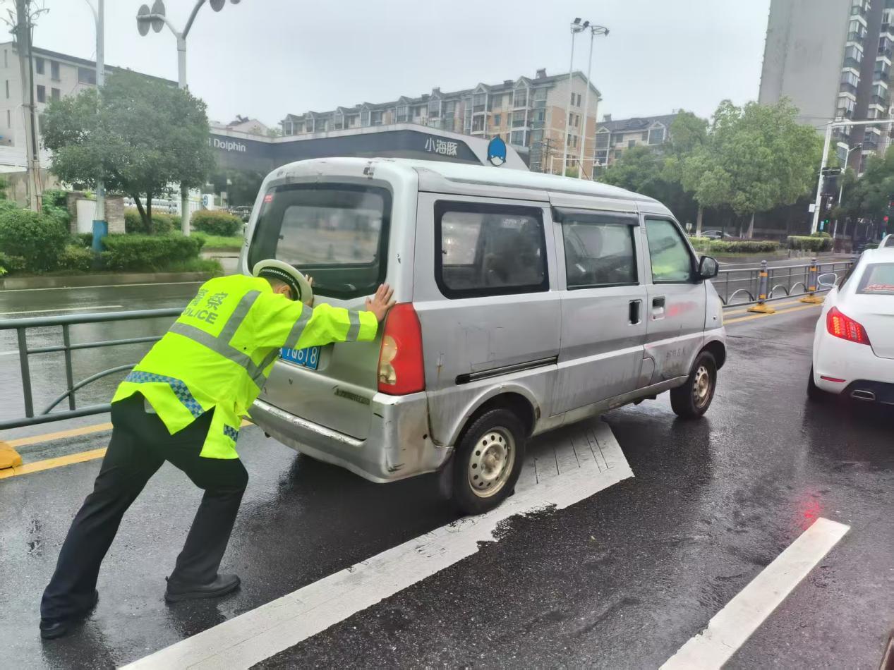 上午10时许,江夏大道十一万路口上坡路段,一辆面包车突发故障抛锚,湿滑的路面和停滞的车辆迅速导致后方车流积压。现场执勤的快骑队员敖鹏化身“推车侠”,迅速设置好安全警示,随即与车主合力将故障车推离主干道,短短几分钟,湿滑拥堵的路段重归有序。