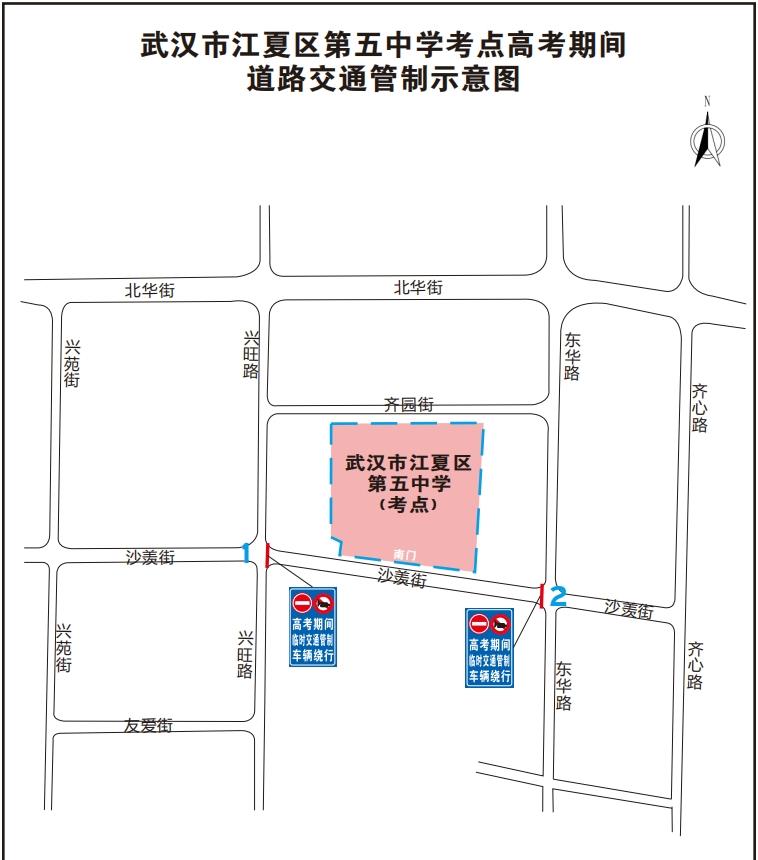 管控区域:6月7日考试期间,沙羡街与兴旺路路口、沙羡街与东华路路口实行临时交通管制,禁止机动车进入考区路段。