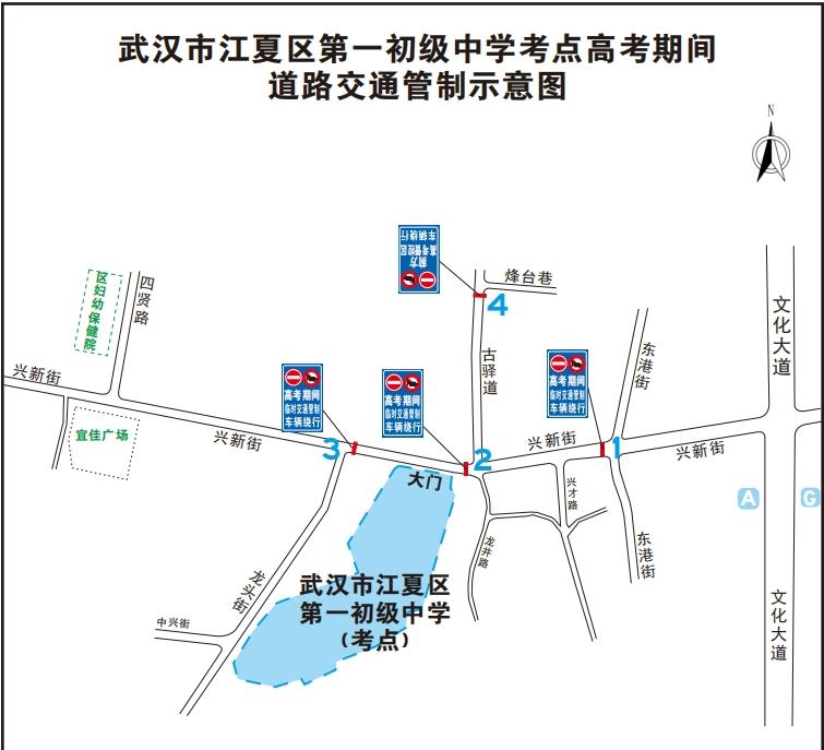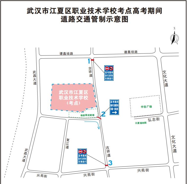 管控区域:6月7日-9日考试期间,古驿道与谭鑫培街路口、古驿道与兴苑街路口实行临时交通管制,禁止机动车进入考区路段;古驿道与杨家湾还建小区路段实行临时交通管制,禁止机动车进入考区路段;车辆由武昌大道、文化大道绕行。