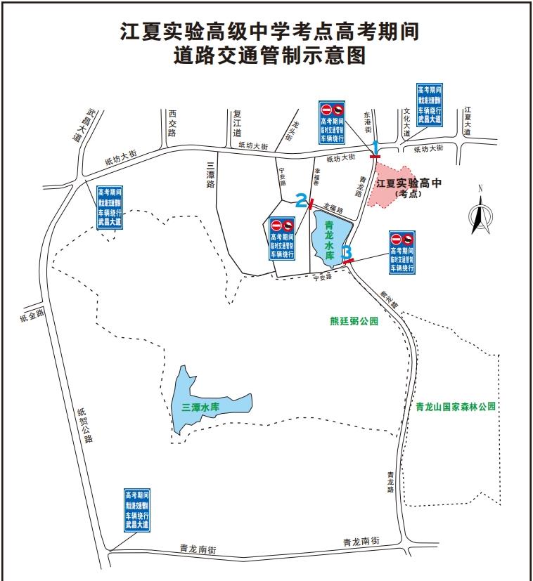 管控区域:6月7日-9日考试期间,青龙路与纸坊大街路口、青龙路与宁安路路口实行临时交通管制,禁止机动车进入考区路段;幸福巷与龙福路路口实行临时交通管制,禁止机动车进入考区路段;青龙路交通管制期间,车辆请绕行武昌大道。