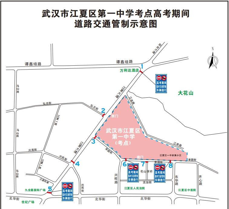 管控区域:6月7日-9日考试期间,江夏大道与谭鑫培路路口、江夏大道与弘志街路口、江夏大道与莘园街路口、江夏大道与兴苑街路口、江夏大道与北华街路口实行临时交通管制,禁止机动车进入考区路段;莘园路与兴旺路路口、莘园街与花山学府路口、莘园街与东华路路口实行临时交通管制,禁止机动车进入考区路段。