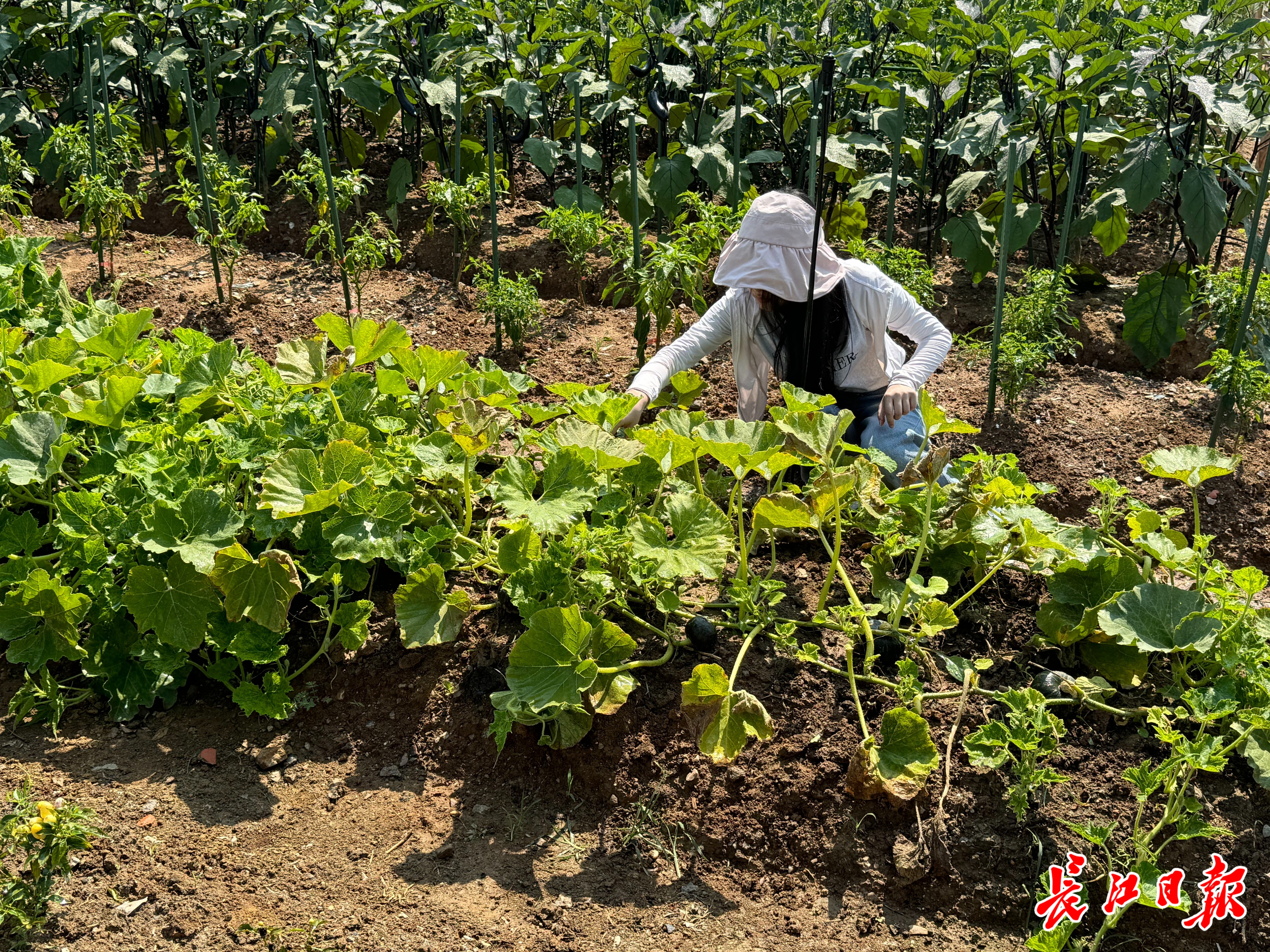 茄子、辣椒、竹叶菜、香瓜……6月5日早晨,正在采摘蔬果的谢玉华脸上洋溢着丰收的喜悦,她是武汉经开区东荆街附近村民,正在代管的共享田园帮忙除草、采摘,每天可以赚取百余元。