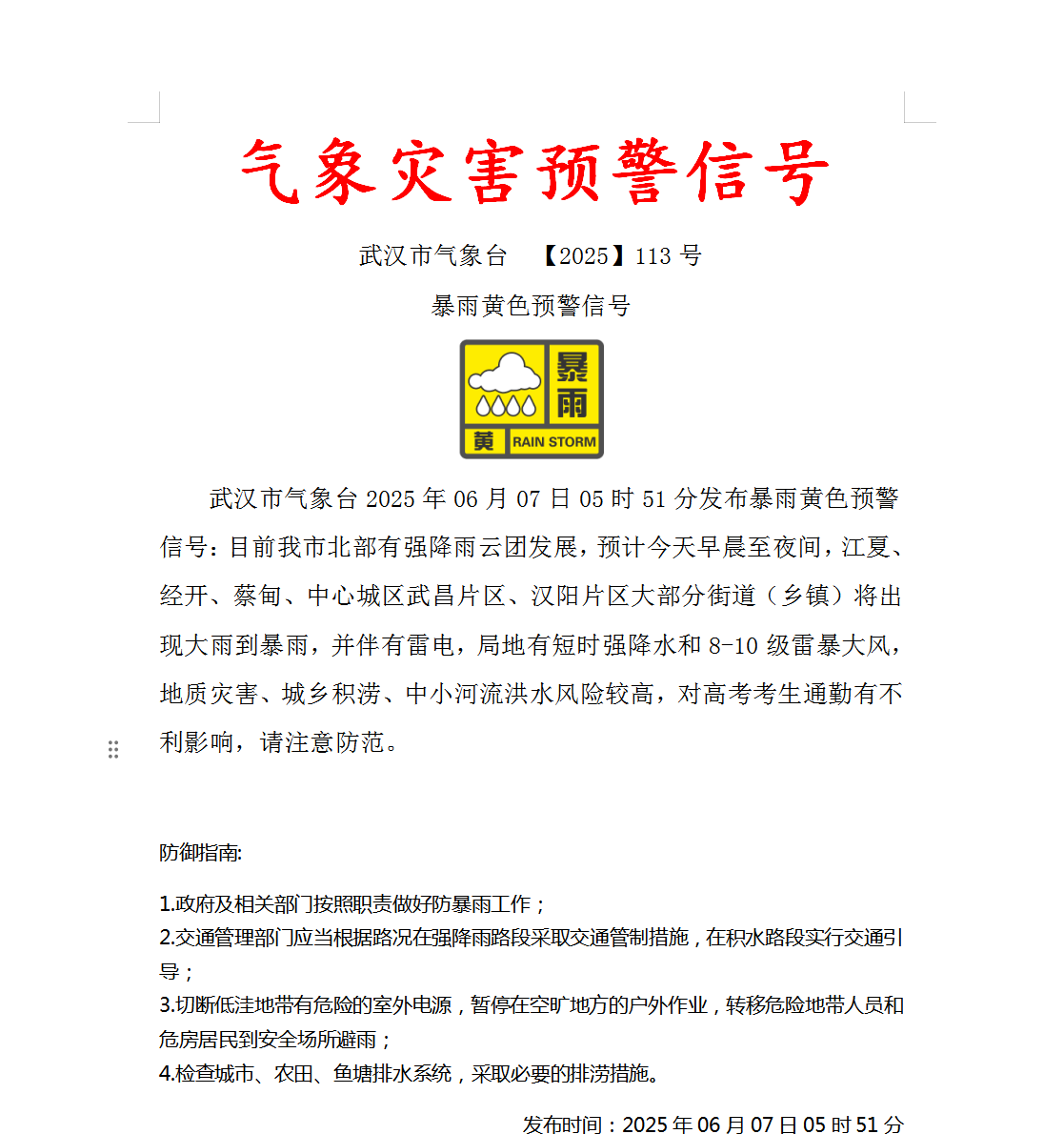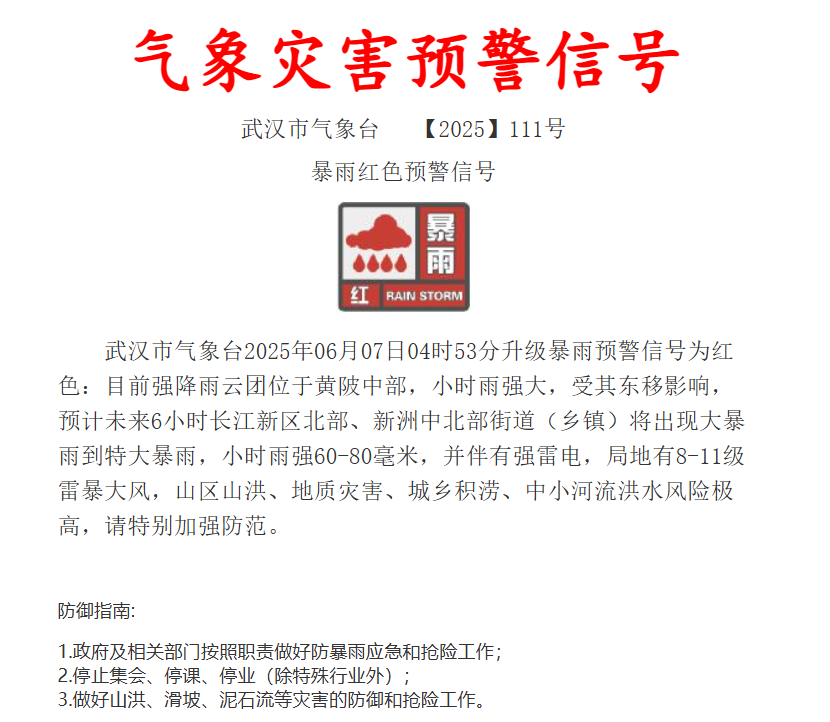 6月7日4时53分,武汉市气象台发布暴雨红色预警:
