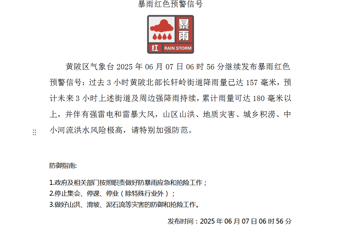 6月7日6时56分,黄陂区气象台继续发布暴雨红色预警: