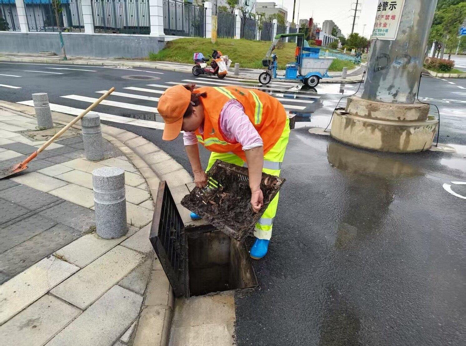 环卫工人清理雨水箅子,防止道路出现积水