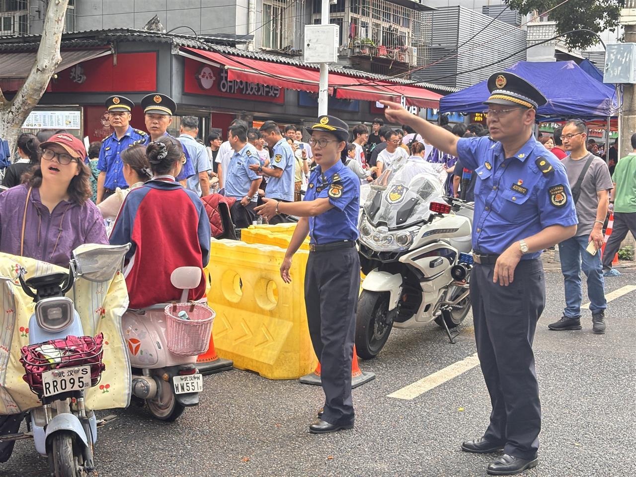 “您好,电动车请停到指定区域,这里是大巴车通道!”6月7日清晨7点半,在吴家山中学高考考点外,东西湖区城管综合执法大队大队长江波正带领队员紧张有序地疏导交通。