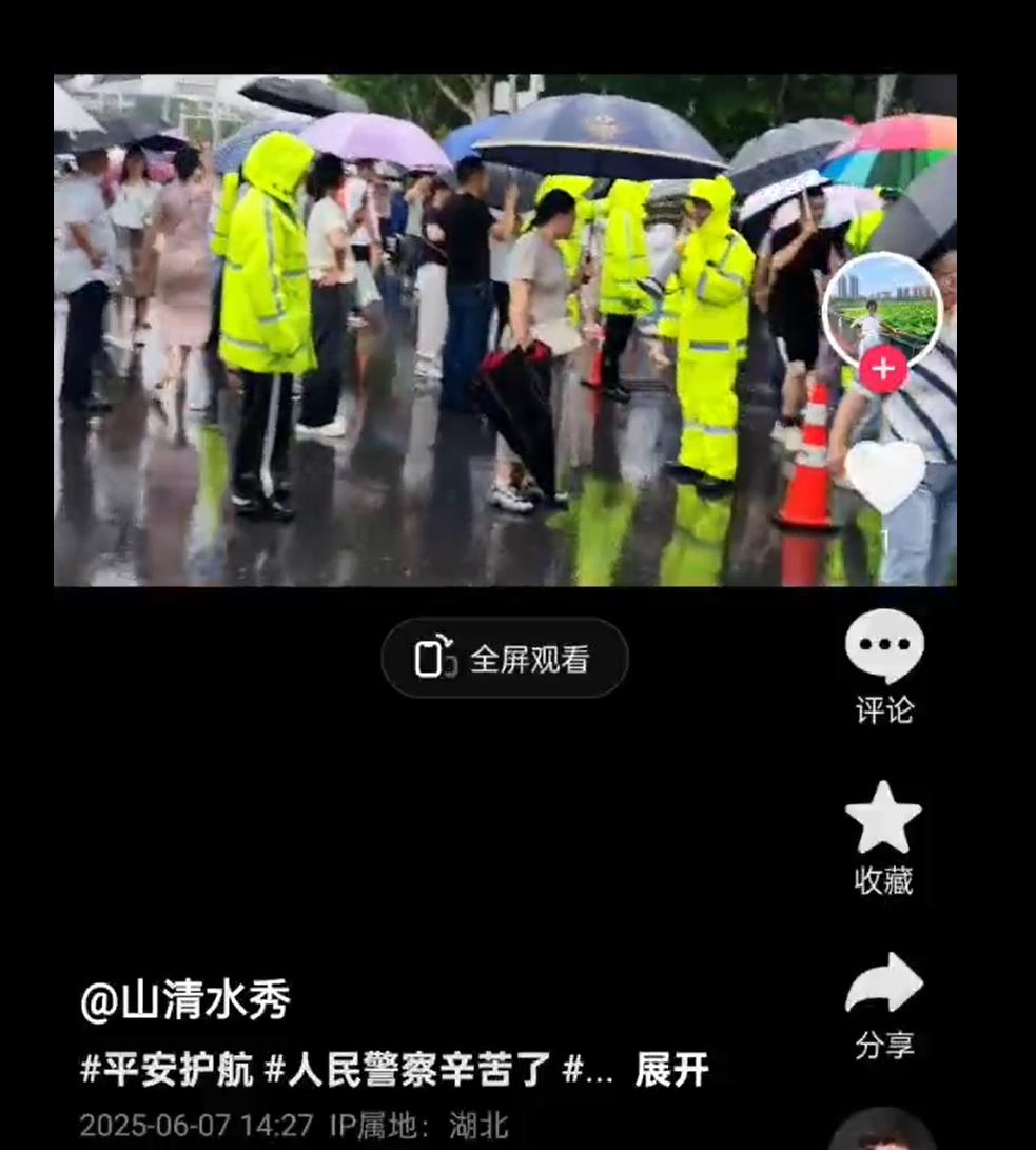 考场外的王阿姨被这一幕深深触动,用手机记录下感人瞬间,并在抖音账号“山清水秀”发布视频,配文“护航高考,人民警察辛苦了!”,表达对交警冒雨护考的敬意与感激。