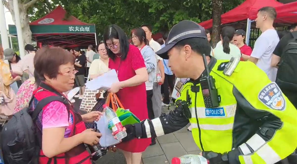 “来,喝瓶矿泉水”当日上午,武汉经开区公安分局交通大队会同辖区“岚图公司”、江汉大学、志愿者等为参加高考的师生和家长送上矿泉水、扇子等降温物品。高考期间,开始下大雨,民警换上雨装,坚守考点服务考生。