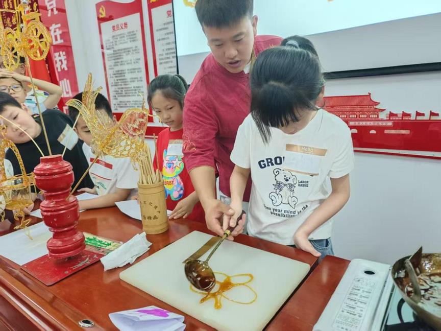 理论讲解后,孩子们纷纷化身“小小设计师”,在纸上勾勒心中所想:威风凛凛的大刀、憨态可掬的小兔、振翅欲飞的蝴蝶……随后,王浩东的大手覆上孩子的小手,稳握温热的铜勺。金黄的糖浆如灵动丝线,随着手腕精准地提、顿、收、放,在大理石板上蜿蜒流淌。空气中弥漫着焦糖香气,孩子们屏息凝神,看着自己的想象在老师引导下,凝固成甜蜜的艺术品。家长们也难掩兴致,纷纷举起手机记录下这珍贵瞬间。