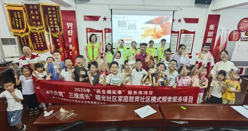 6月7日,窗外阴云密布、暴雨倾盆,而武汉东湖高新区关东街道曙光社区活动室内却暖意融融、甜蜜四溢。当日,一场由曙光社区联合光谷壹新社工机构精心策划的青少年传统文化体验活动“妙笔生糖,非遗传承”糖画艺术课在此火热举行。参与活动的25组亲子家庭热情高涨,在武汉职业技术大学6名青年志愿者的协助下,共同开启了一场甜蜜的非遗文化之旅。