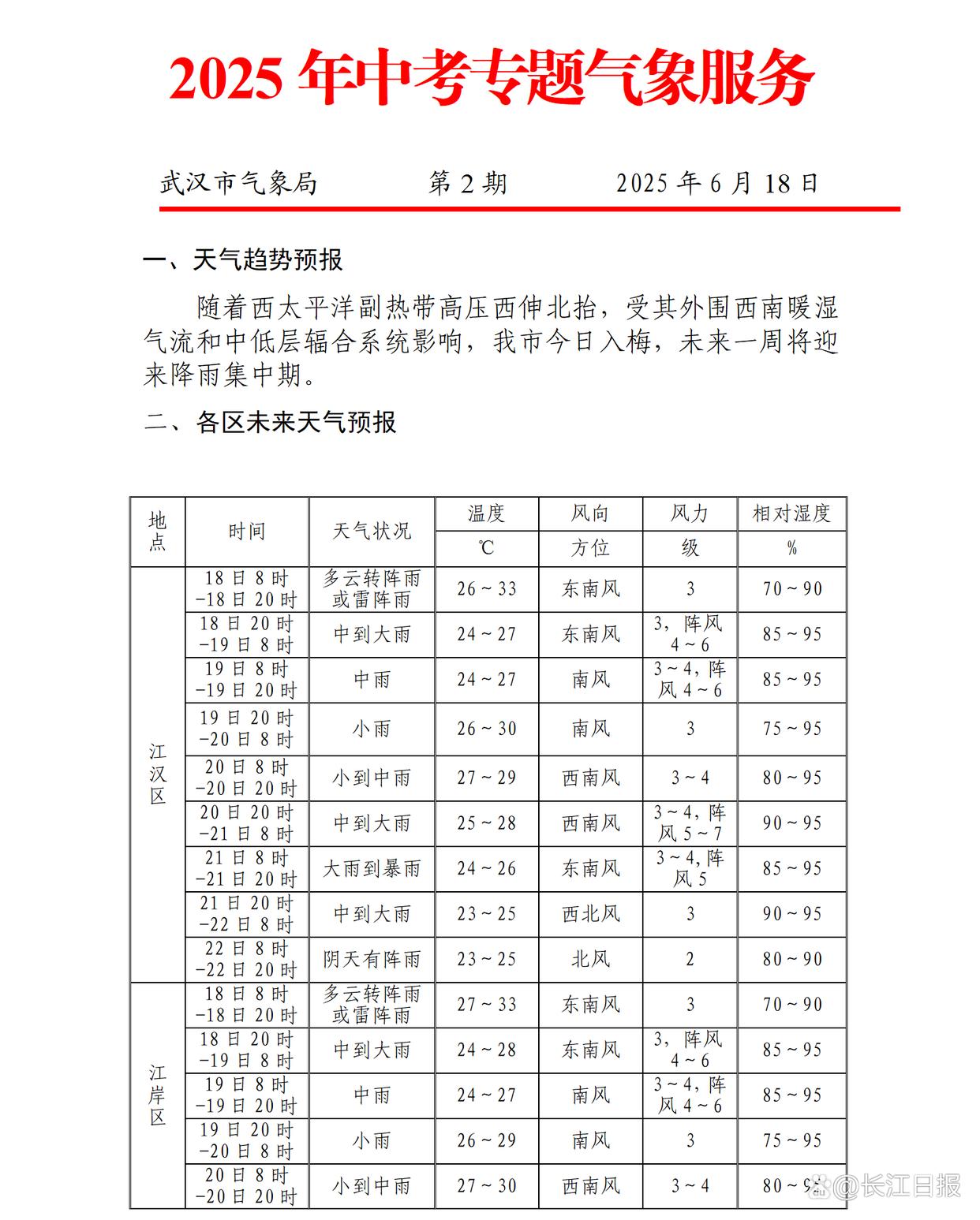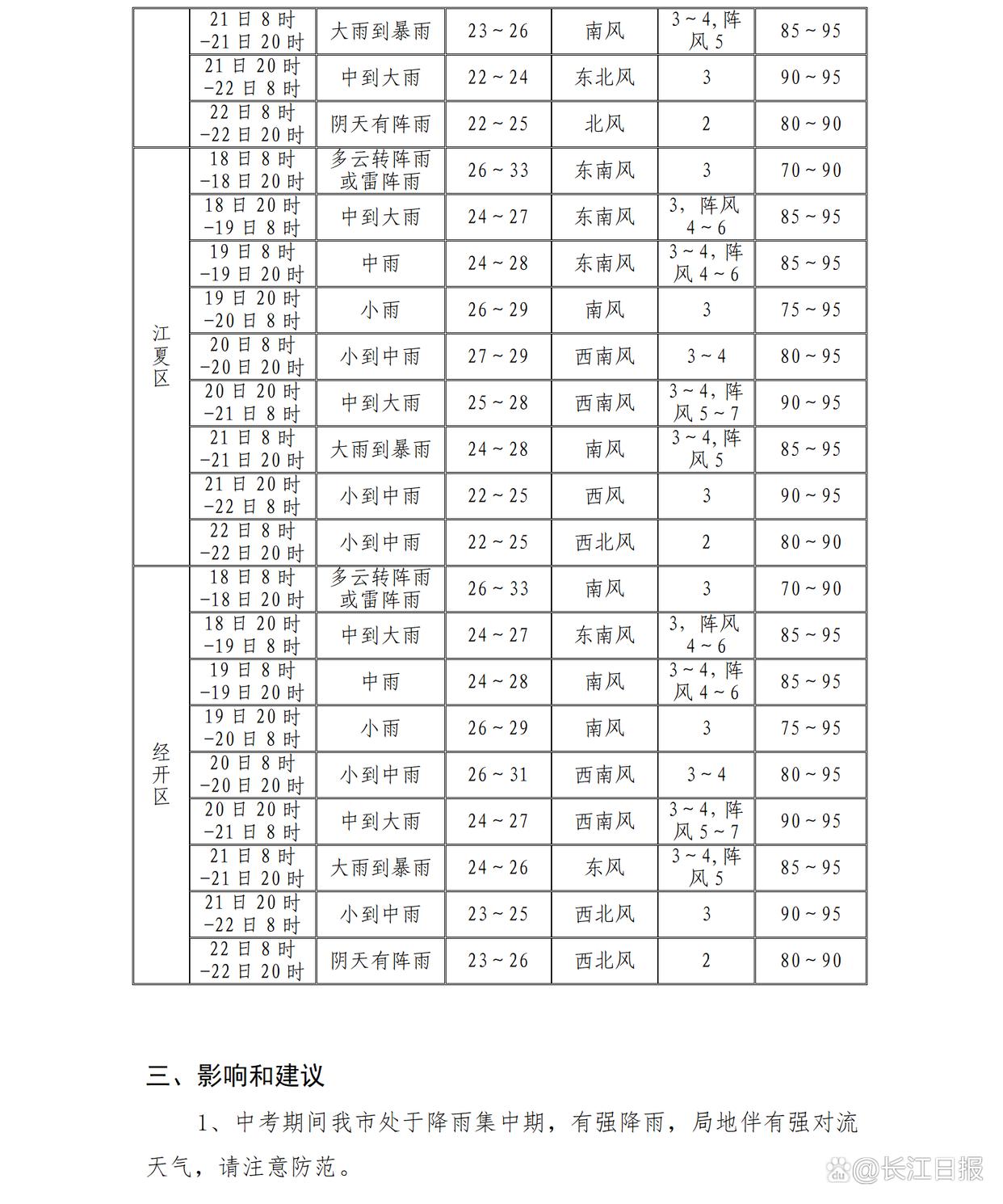 武汉中考遇上降雨集中期,最新天气预报