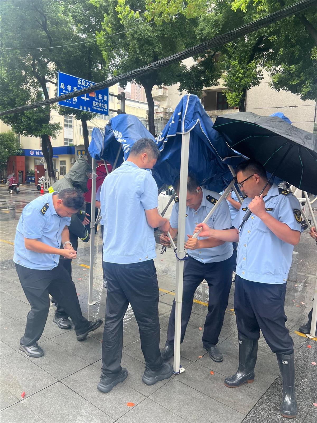6月20日,中考拉开帷幕,暴雨也再次“强势登场”。武汉市东西湖区吴家山街道综合执法中心队员清晨7点便准时抵达吴家山第三中学、吴家山第二中学、东西湖初级中学等考点,全天候坚守,为考生们铺就一条安心赴考之路。
