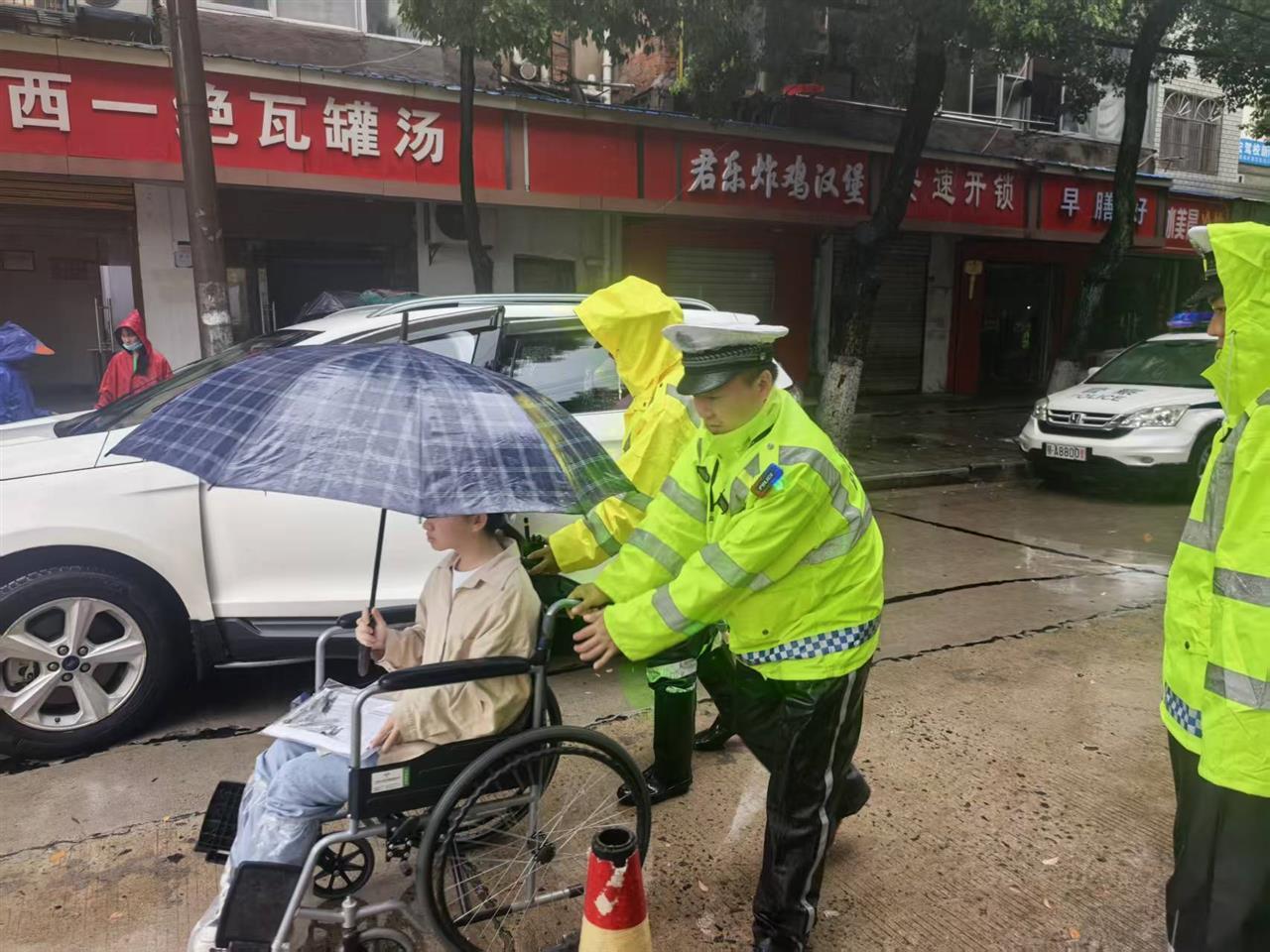 李江立即协助,和辅警夏进,李伟一起,推着轮椅把考生送到考点,又和考点工作人员把考生送进考场。