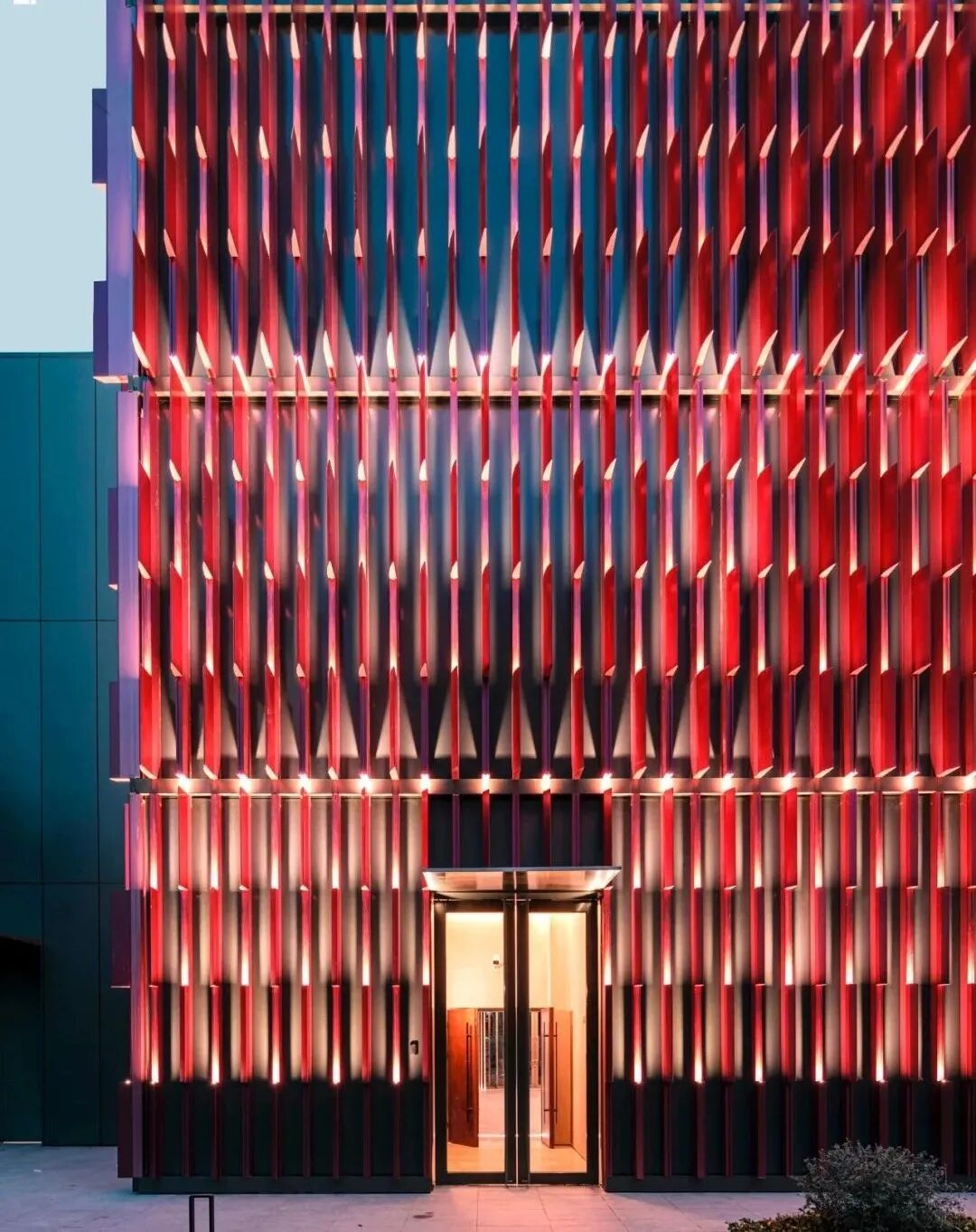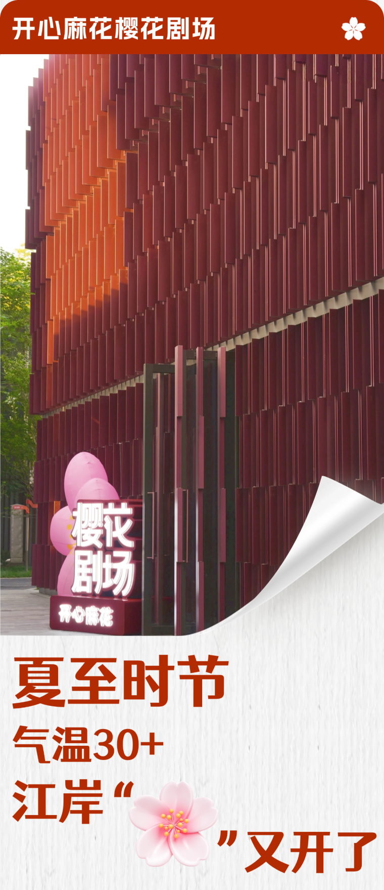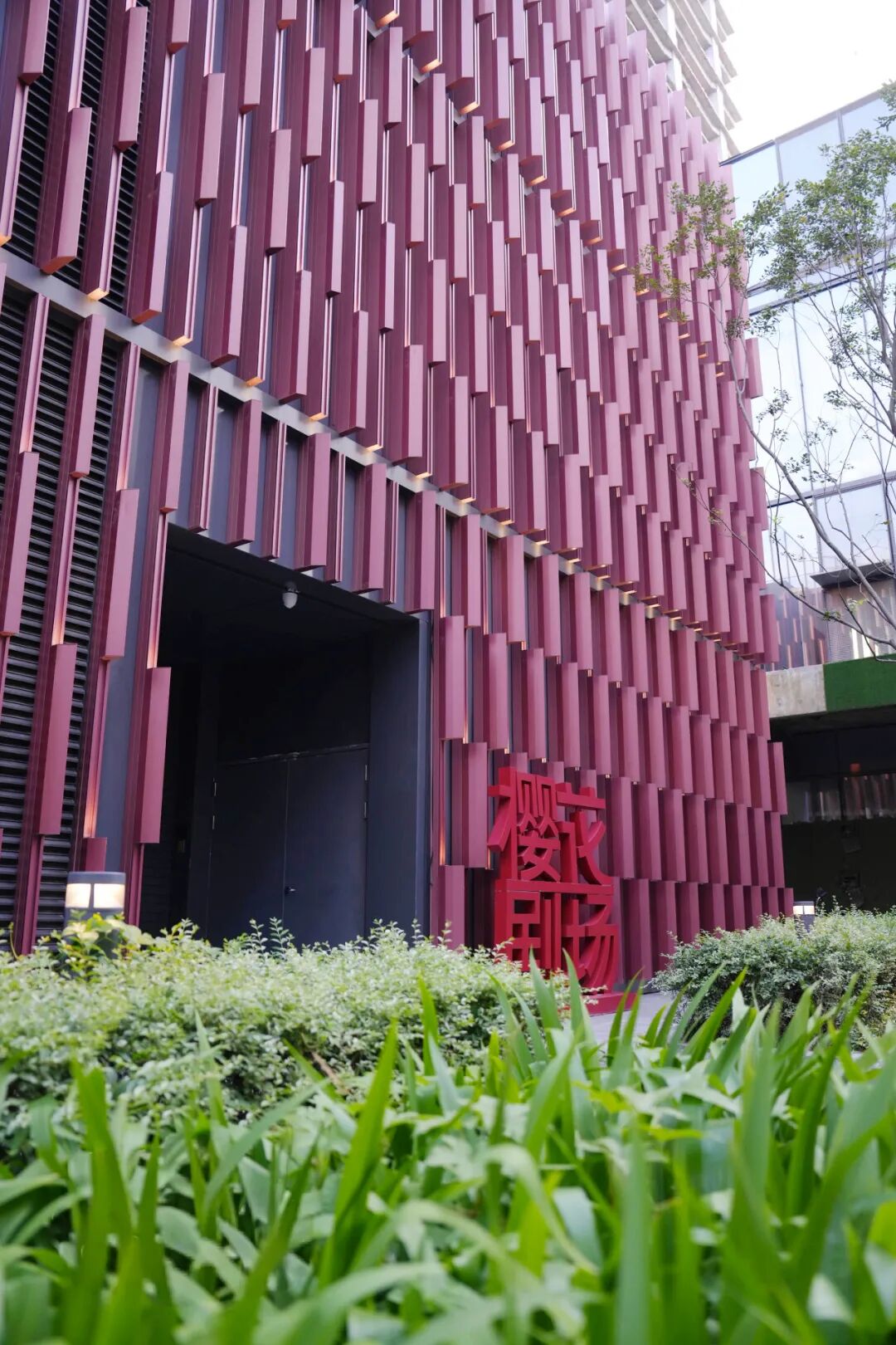 📹📹📹 开心麻花樱花剧场以「像素樱花」为设计灵感,外立面由两万余片“樱花红”金属铝板与玻璃幕墙巧妙嵌合。 每一块铝板背面安装有灯光装置,打造可与街区行人互动的光影系统。 白天如樱花主题建筑雕塑,夜晚灯光亮起,化身光影艺术装置,璀璨亮眼。