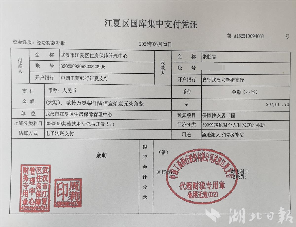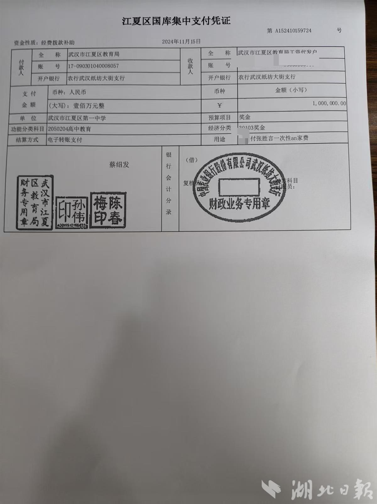 2024年7月,江夏区教育局根据相关流程,将张胜言引进至江夏一中,担任高一(18)班班主任。当年11月15日,江夏区教育局以电子转账形式,将100万元一次性安家费拨付到他个人账上。