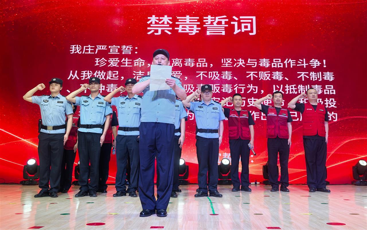 随后,派出所民警代表带领禁毒民警和社工代表登上舞台,全体人员表情庄重,台下观众也纷纷起身,大家共同许下坚定誓言:“我是中华民族的儿女,铭记历史耻辱,坚决与毒魔抗争到底。珍爱生命,远离毒品,保证不吸毒、不贩毒、不制毒、不种毒,积极检举吸贩毒行为,自觉抵制毒品侵蚀,全身心投入禁毒斗争,为国家禁毒事业贡献力量。” 誓言铿锵有力,在全场回荡,彰显出大家对禁毒工作的坚定支持与参与禁毒斗争的无畏勇气。