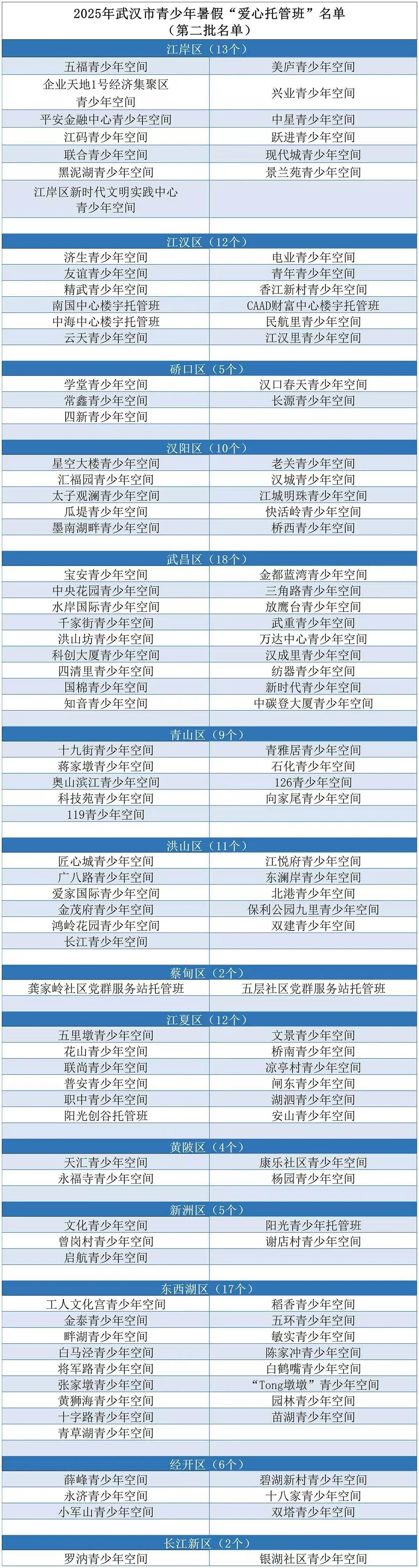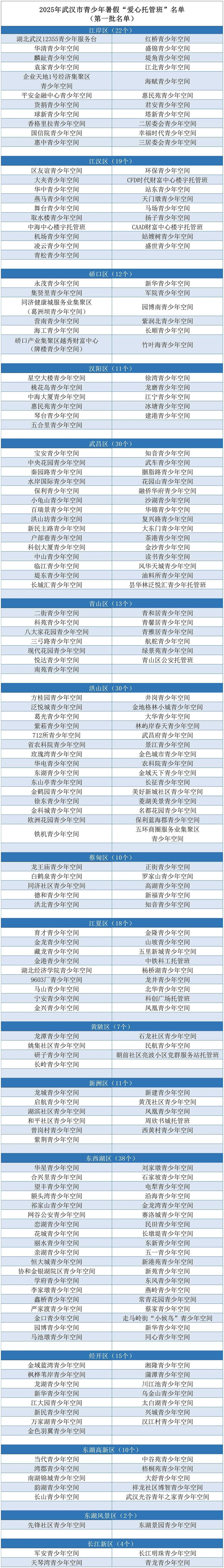 “你上班,我带娃!”6月28日,极目新闻记者从共青团武汉市委获悉,2025年武汉市青少年暑假“爱心托管班”,即6月30日起正式启动报名,共开办378个青少年公益托管室,于7月8日至——8月15日(工作日全天)期间,分两个批次开放,开放时间一般为每天上午8点至下午6点,将为在汉小学生提供免费暑期托管服务。