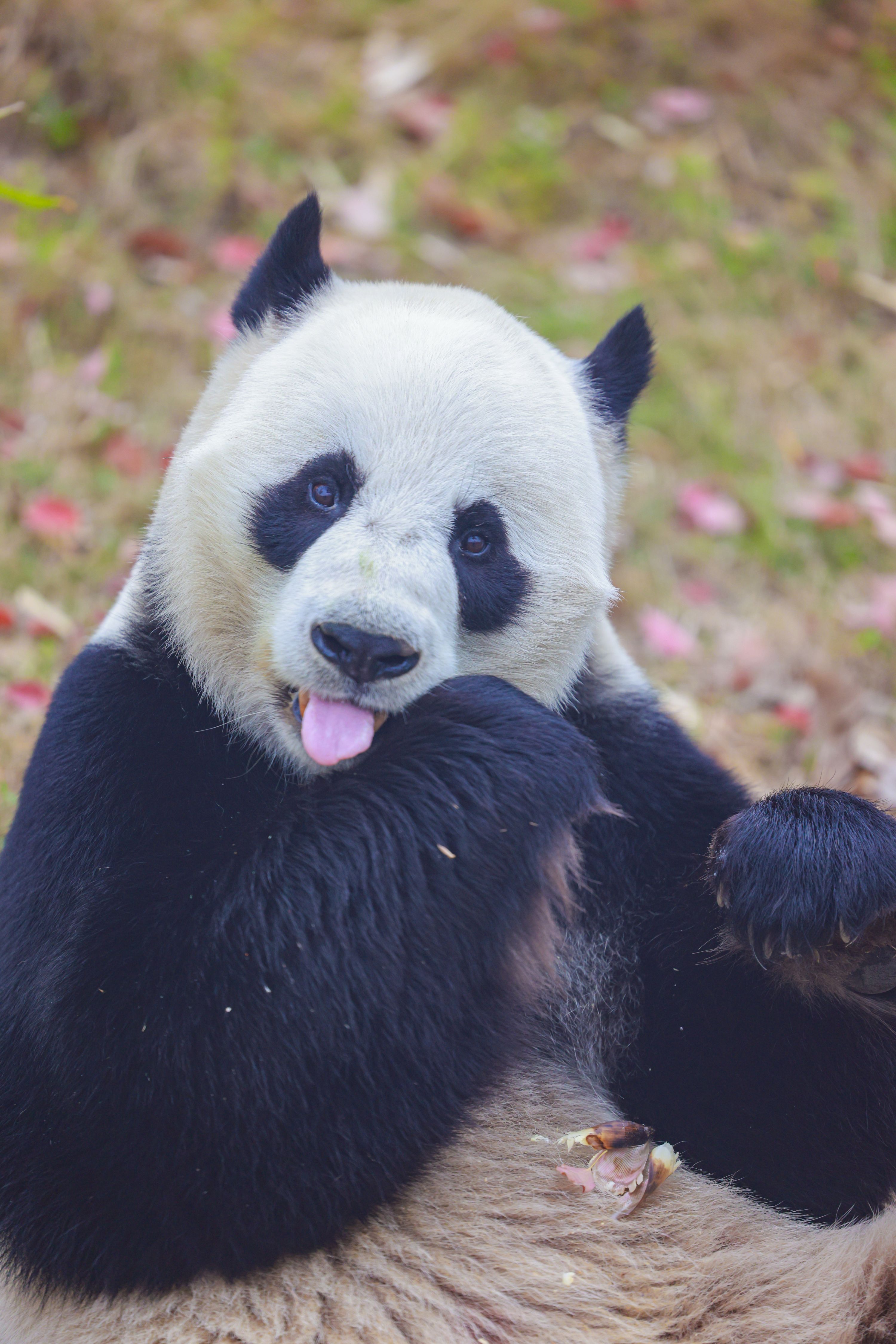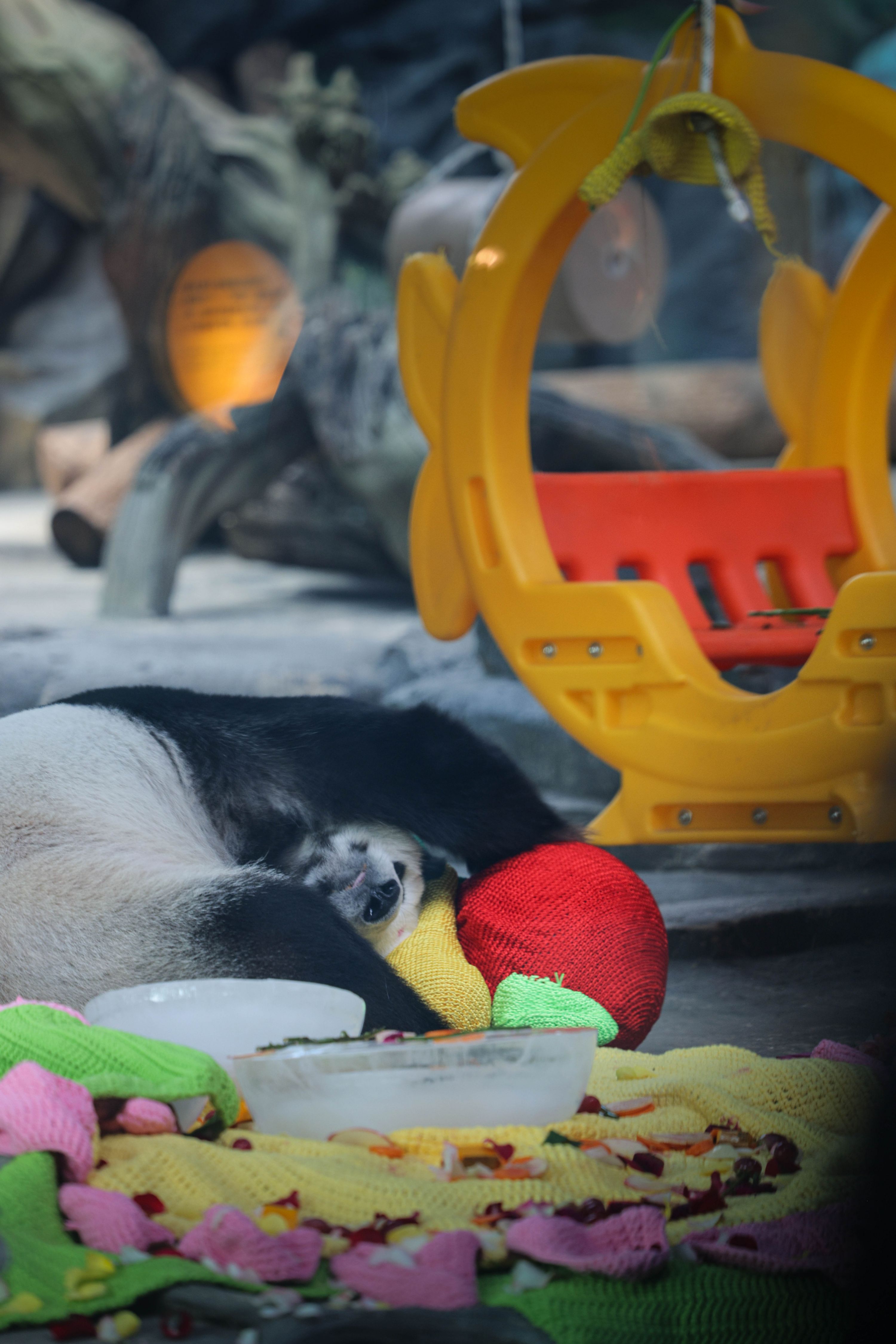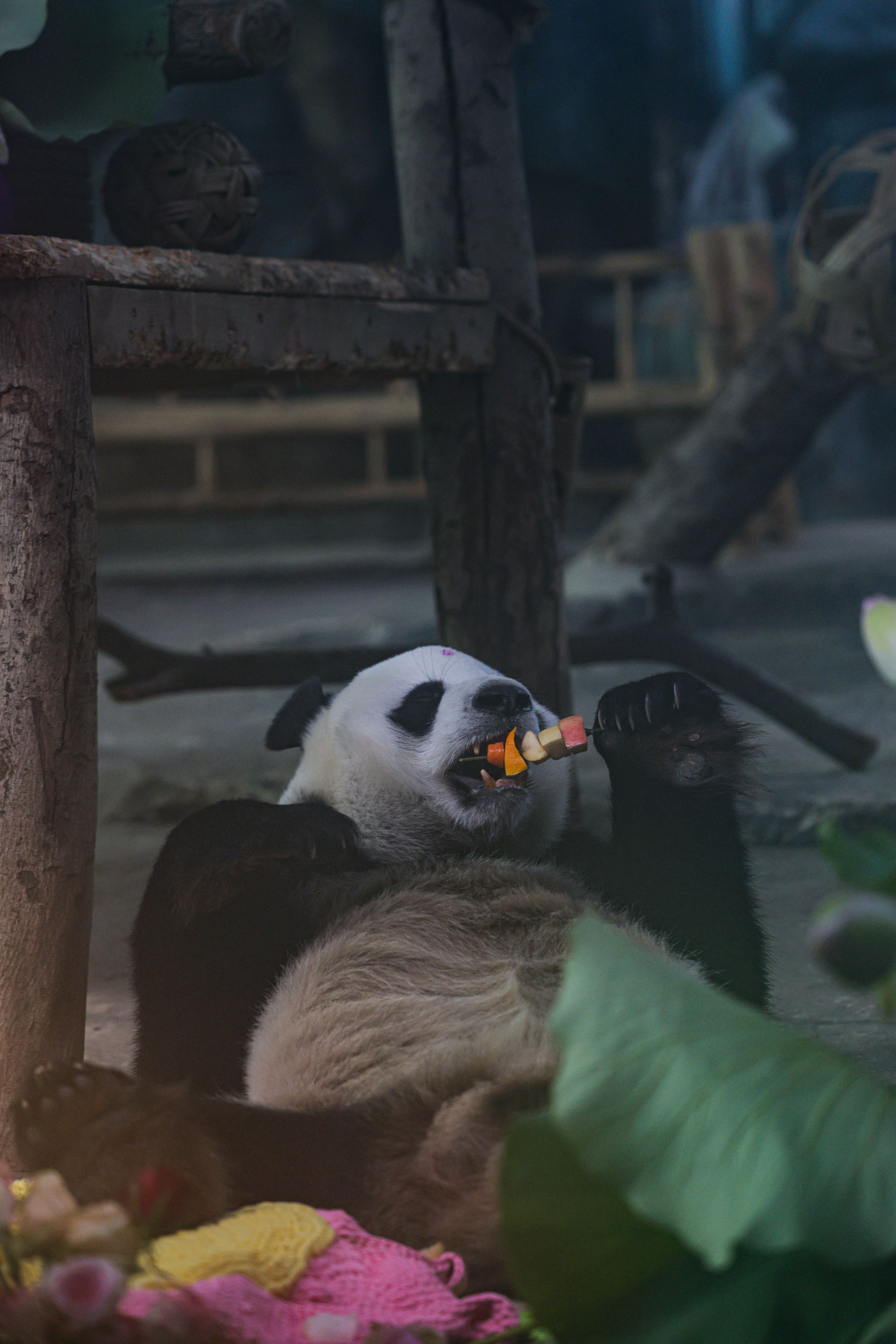大熊猫武林躺着吃生日蛋糕的“烤串”。