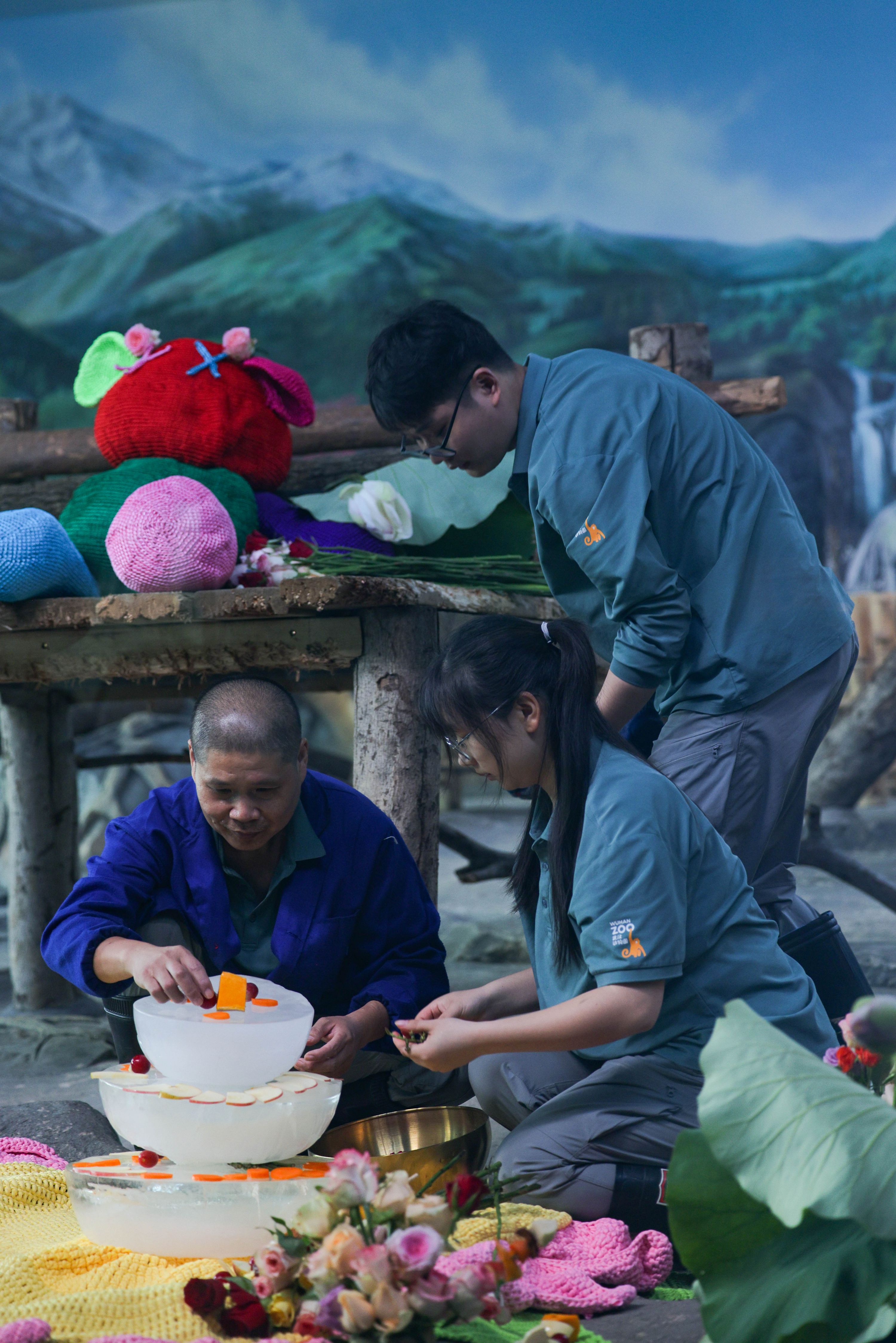 他还介绍,今天生日现场的气味和环境丰容,都是为了在圈养条件下,丰富大熊猫的生活情趣,增添新鲜感,促进它们的探索欲和展示更多的自然行为。