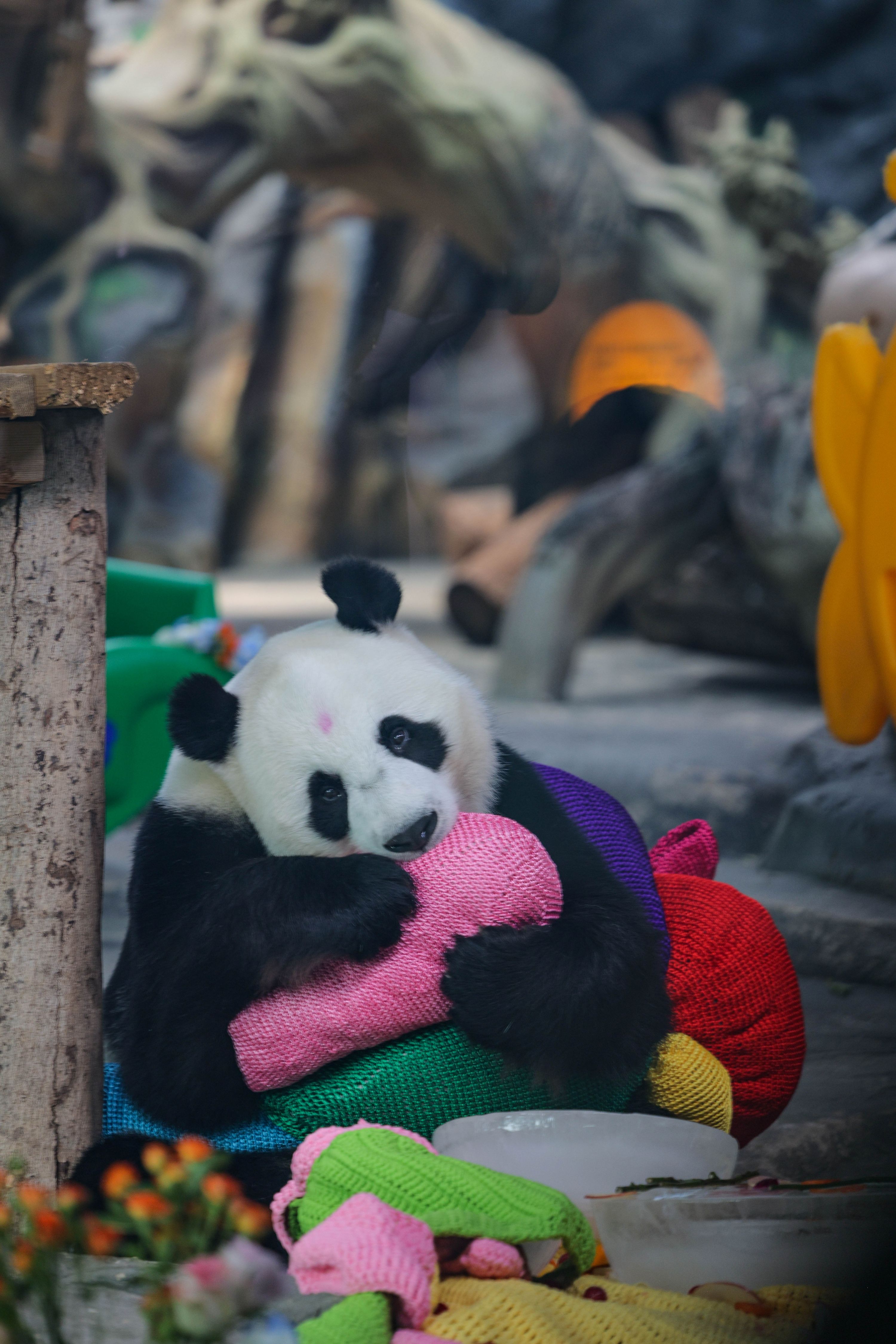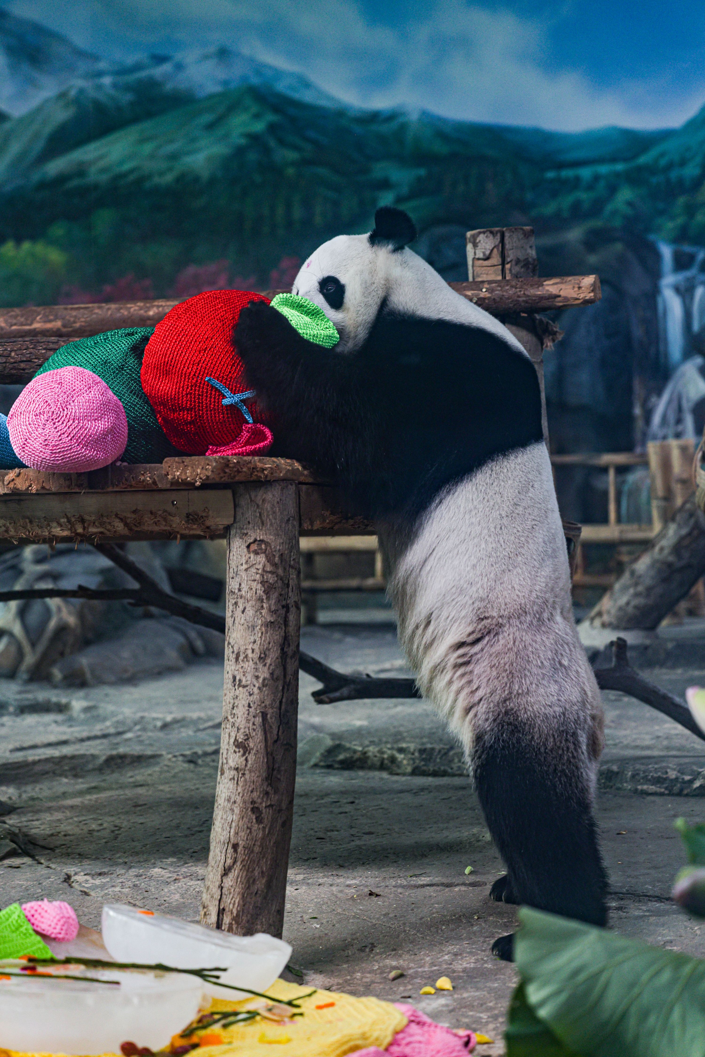 除了吃得好,保育员团队还为大熊猫制定了周密的丰容计划。每隔2—3天就会更换不倒翁、大滚轮、吊床秋千等玩具;每隔3个月左右对调两只大熊猫的展区;还不断创新丰容形式,推出木屑“泡泡浴”、桂花香囊、竹编篮子等。