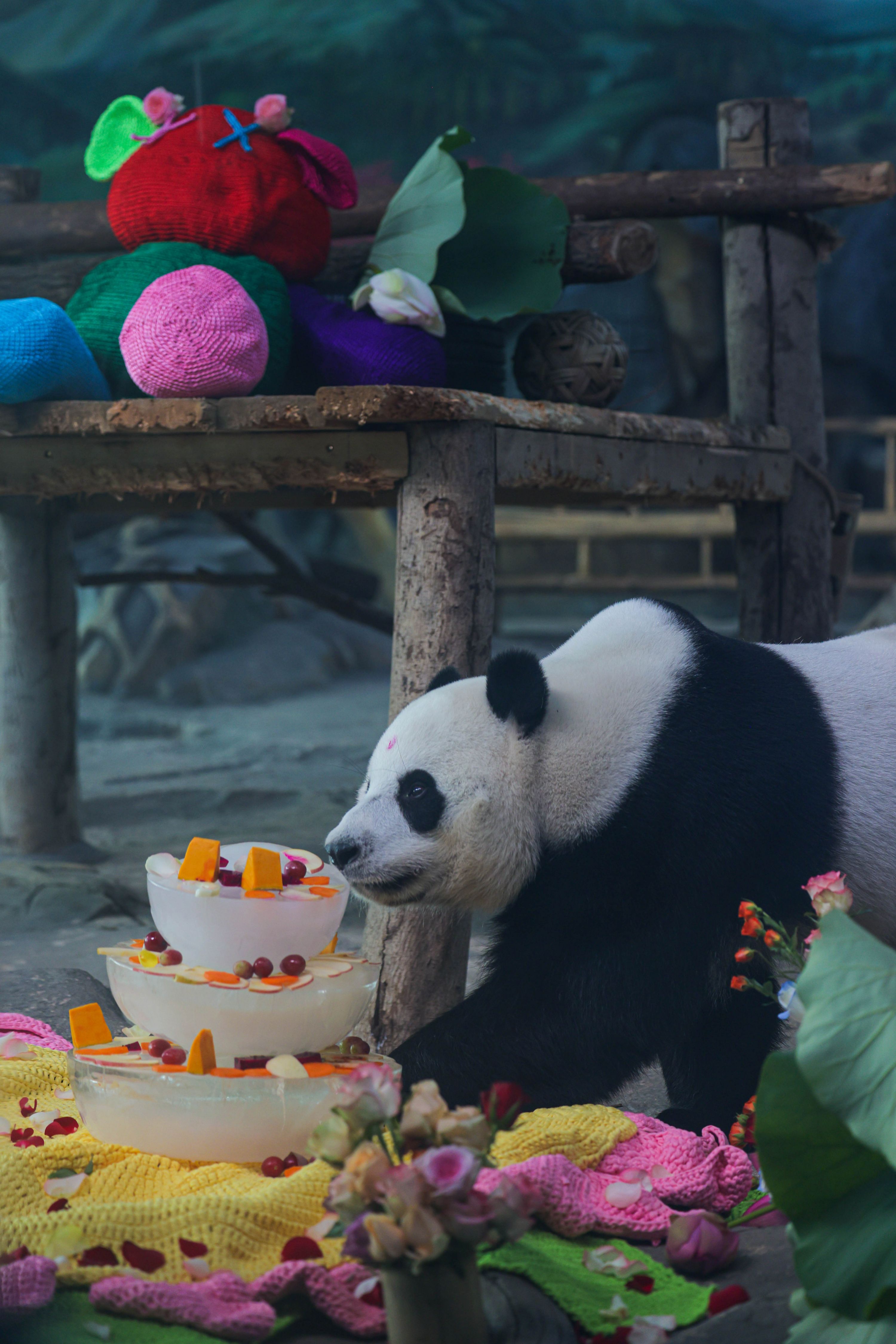 它的生日蛋糕是一个三层冰镇蛋糕,蛋糕以竹笋、窝窝头为基底,铺满苹果、葡萄等时令水果,还点缀有胡萝卜、南瓜等蔬果串成的“烤串”。