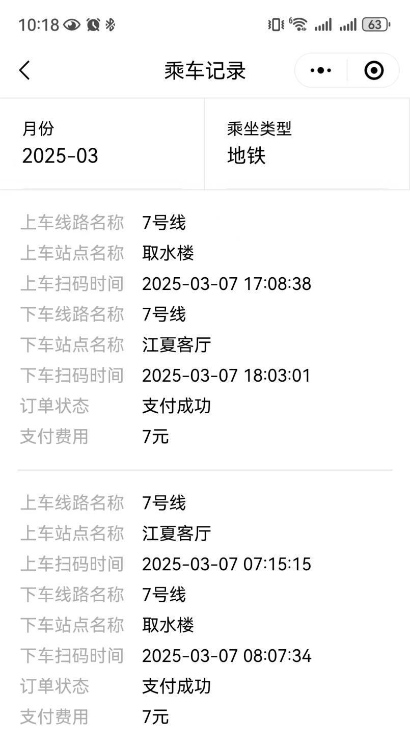 此外,还可查看到“乘车记录”的入口,点击后可进入乘车记录查询页面,选择对应的公共交通类型和月份,即可查询到相应的乘车记录。例如,在乘车记录页面,选择乘坐类型—地铁,可以查看到地铁进出站时间、站点、线路、支付金额、支付状态等信息。