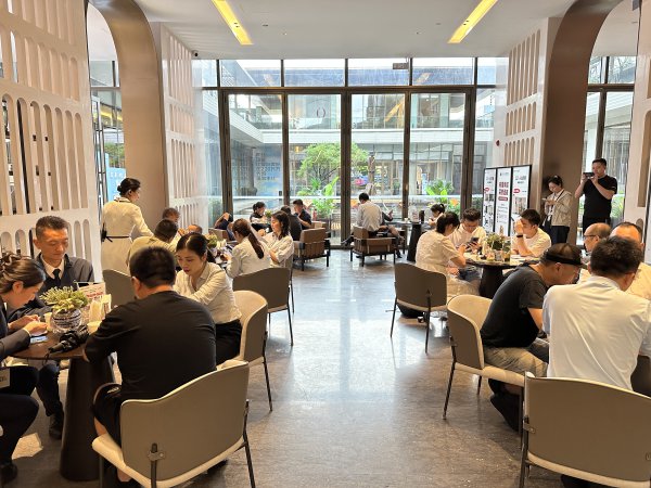7月2日中午,记者在招商·武汉城建未来中心的销售中心看到,洽谈区12桌椅已全部坐满,沙盘区、签约区、茶水吧台前挤满咨询客户。置业顾问手持对讲机穿梭带看,样板间门口甚至排起等待看房的队伍。