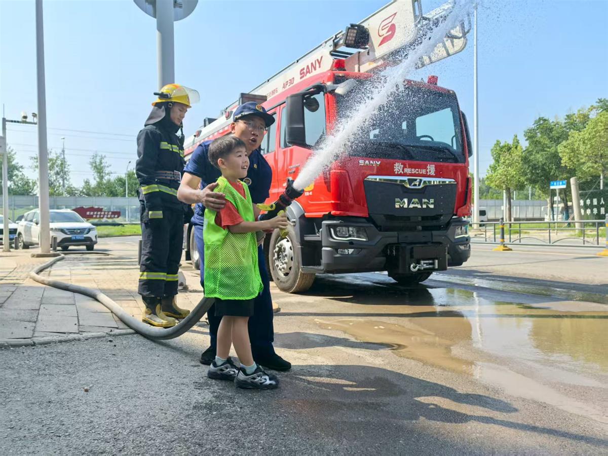 最让孩子们兴奋的是沉浸式的灭火体验环节。在消防员的专业指导和严密保护下,孩子们化身“小小消防员”,亲身体验了手持消防水枪,进行“灭火”的实战场景。虽然水枪有些分量,但在官兵叔叔的帮助下,孩子们努力瞄准“火点”,体验了一把消防员的责任与力量,在实践中深刻理解了灭火器材的使用要点和团队协作的重要性。