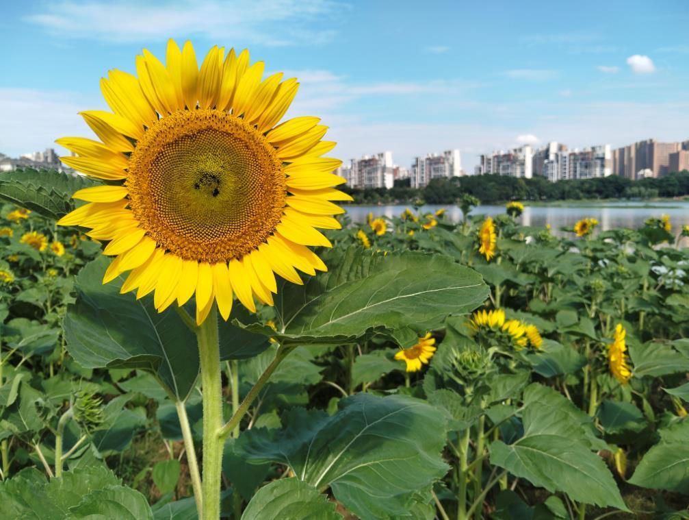 “目前,这片向日葵花田共栽种的面积有3000平方米,花期将持续至八月中下旬。从这两天开始,来这里观赏向日葵的市民多了一些,预计双休日人会更多。”园长熊涛说,眼下接近最佳观赏期,它已蝶变为洪山区公园亮眼的打卡地之一。