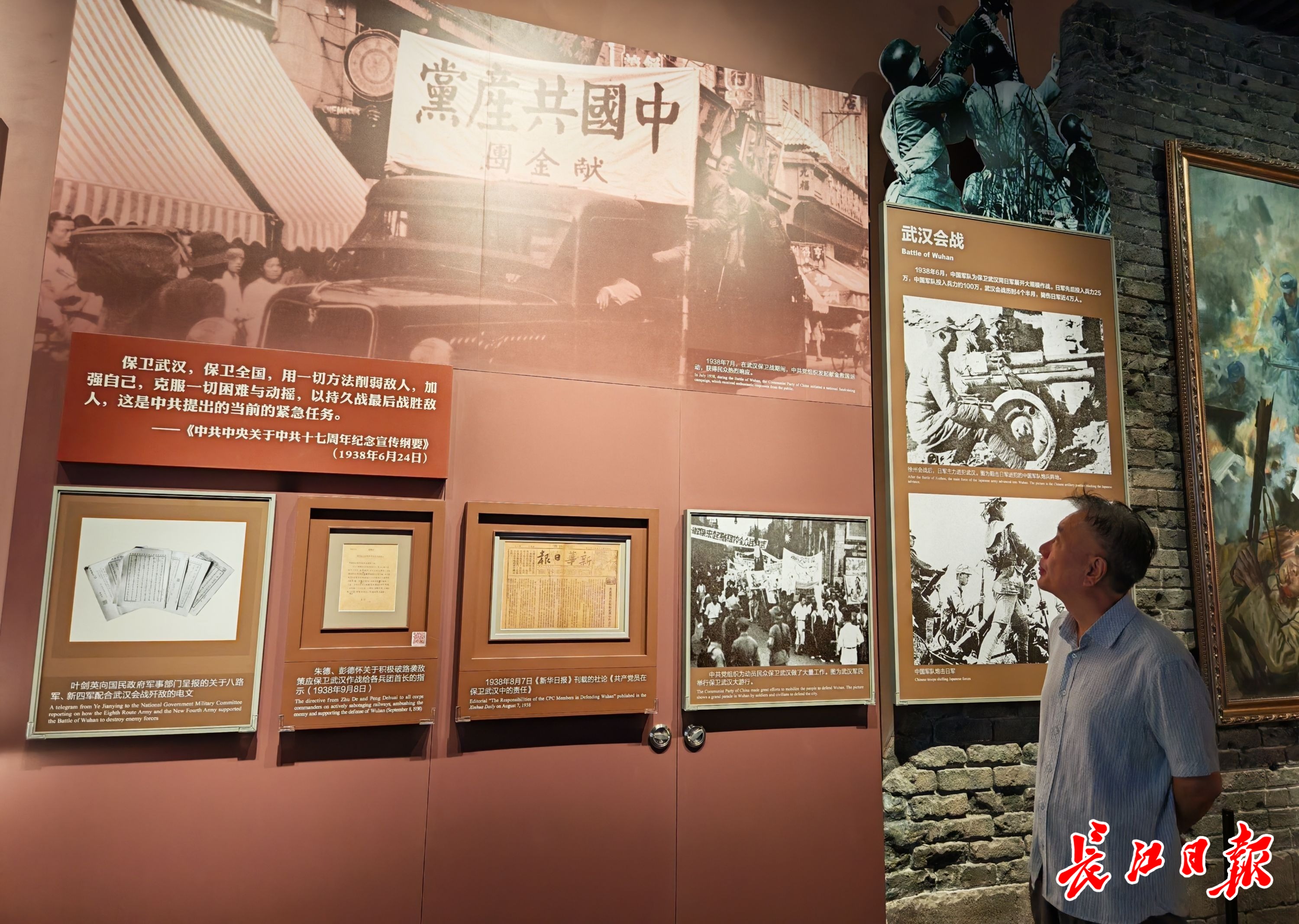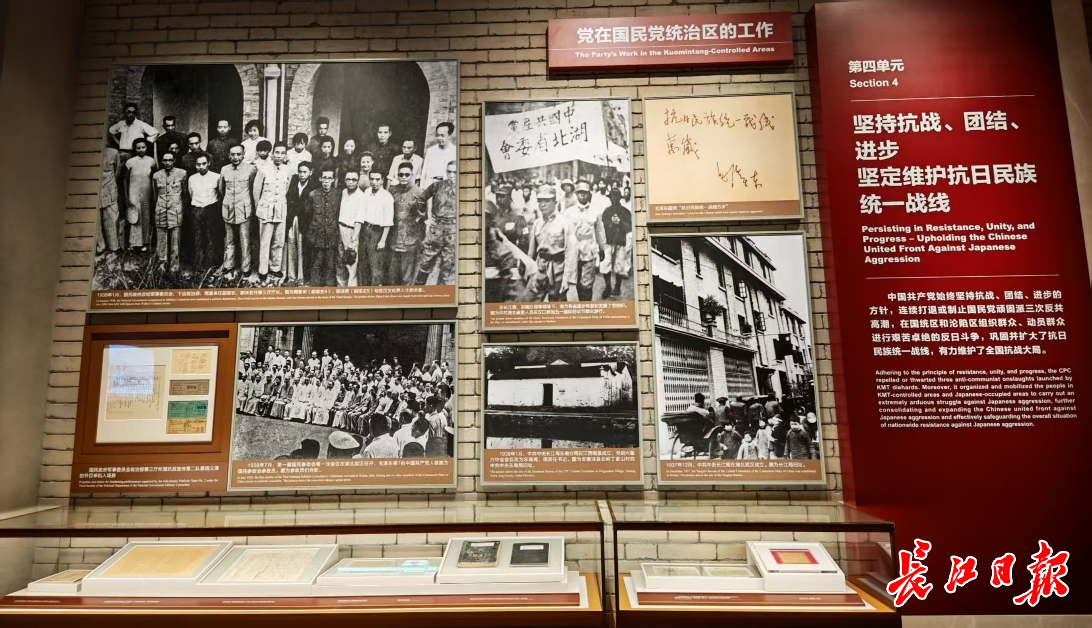 主题展览第一部分的第四单元《坚持抗战、团结、进步坚定维护抗日民族统一战线》中,介绍中国共产党在国民党统治区的工作,武汉曾经是中共维护抗日民族统一战线的中心城市之一。