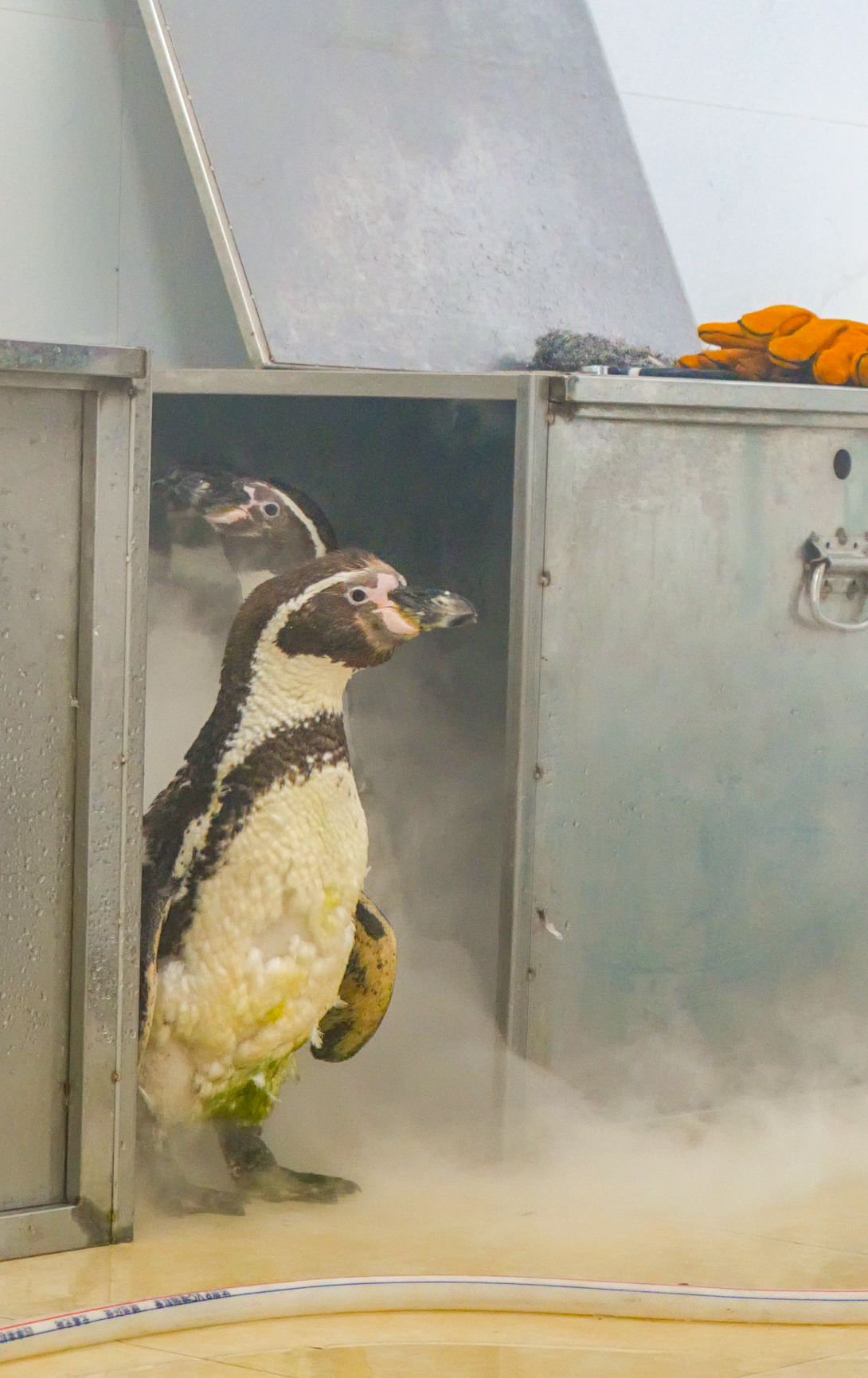 做完雾化的企鹅从箱子中走来。赵端 摄